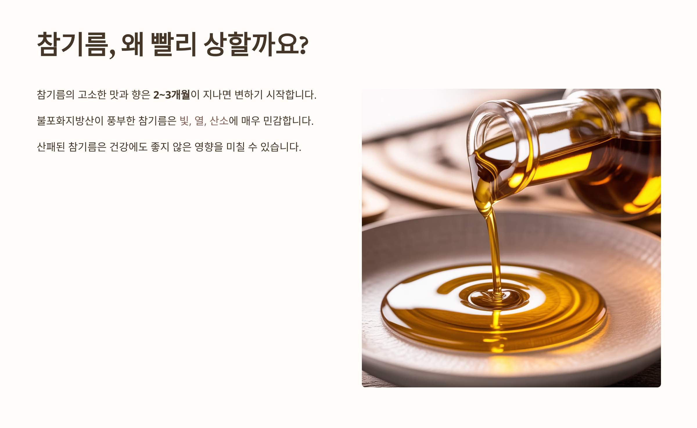 - 산소(공기)와의 접촉: 참기름에는 불포화지방산이 다량 함유되어 있습니다. 공기 중의 산소는 불포화지방산과 반응하여 산화물질을 생성하는데, 이것이 바로 산패입니다. 한번 개봉된 참기름은 공기와 접촉할 때마다 산화가 가속화됩니다. 용기 내부의 참기름이 줄어들수록 공기층이 늘어나 산패 속도가 빨라집니다.