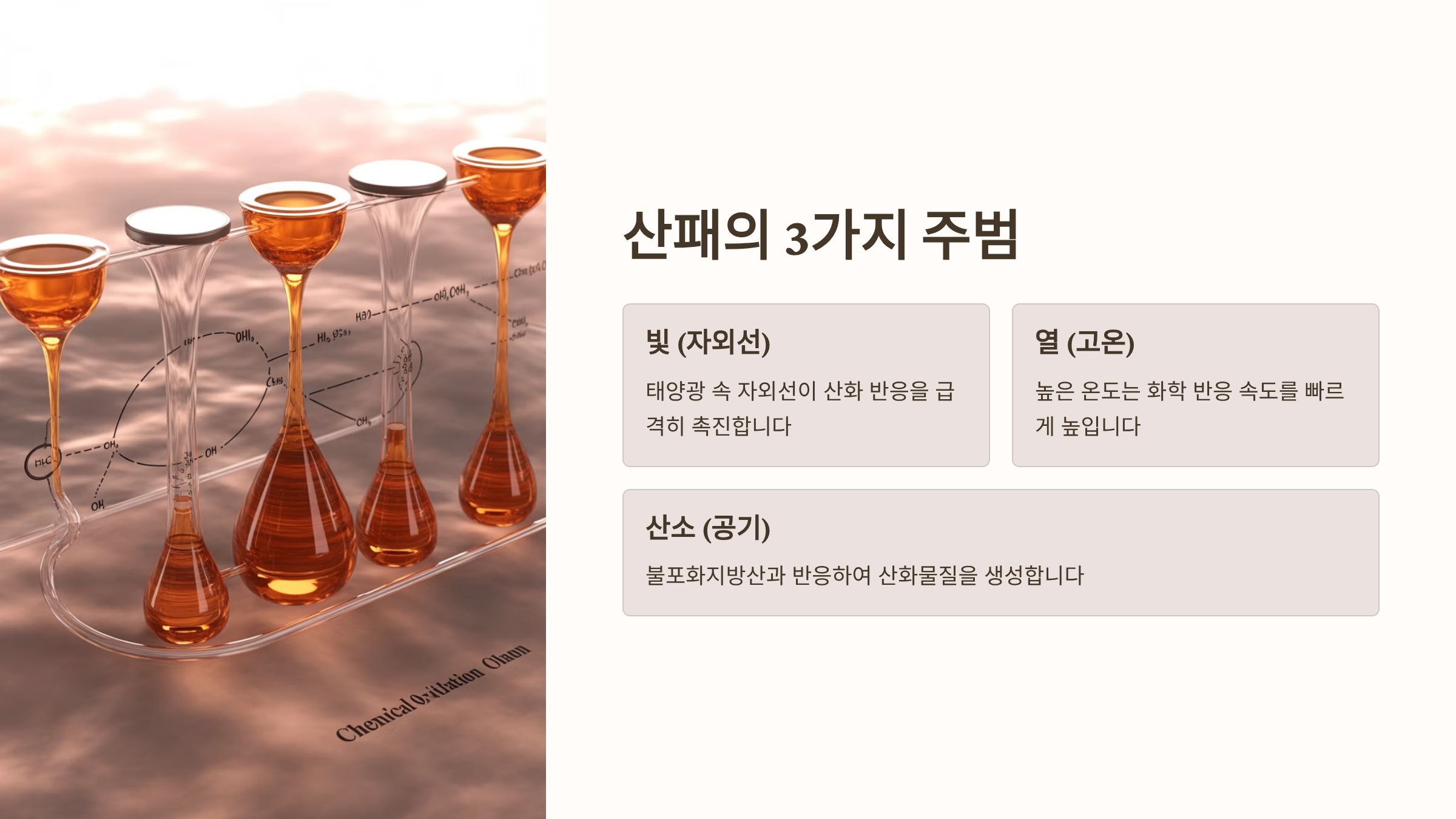 참기름 보관법을 이해하기 위해서는 참기름이 왜 산패되는지 그 원인을 아는 것이 중요합니다. 산패는 화학적 변화로, 참기름의 맛과 건강에 치명적인 영향을 미칩니다.