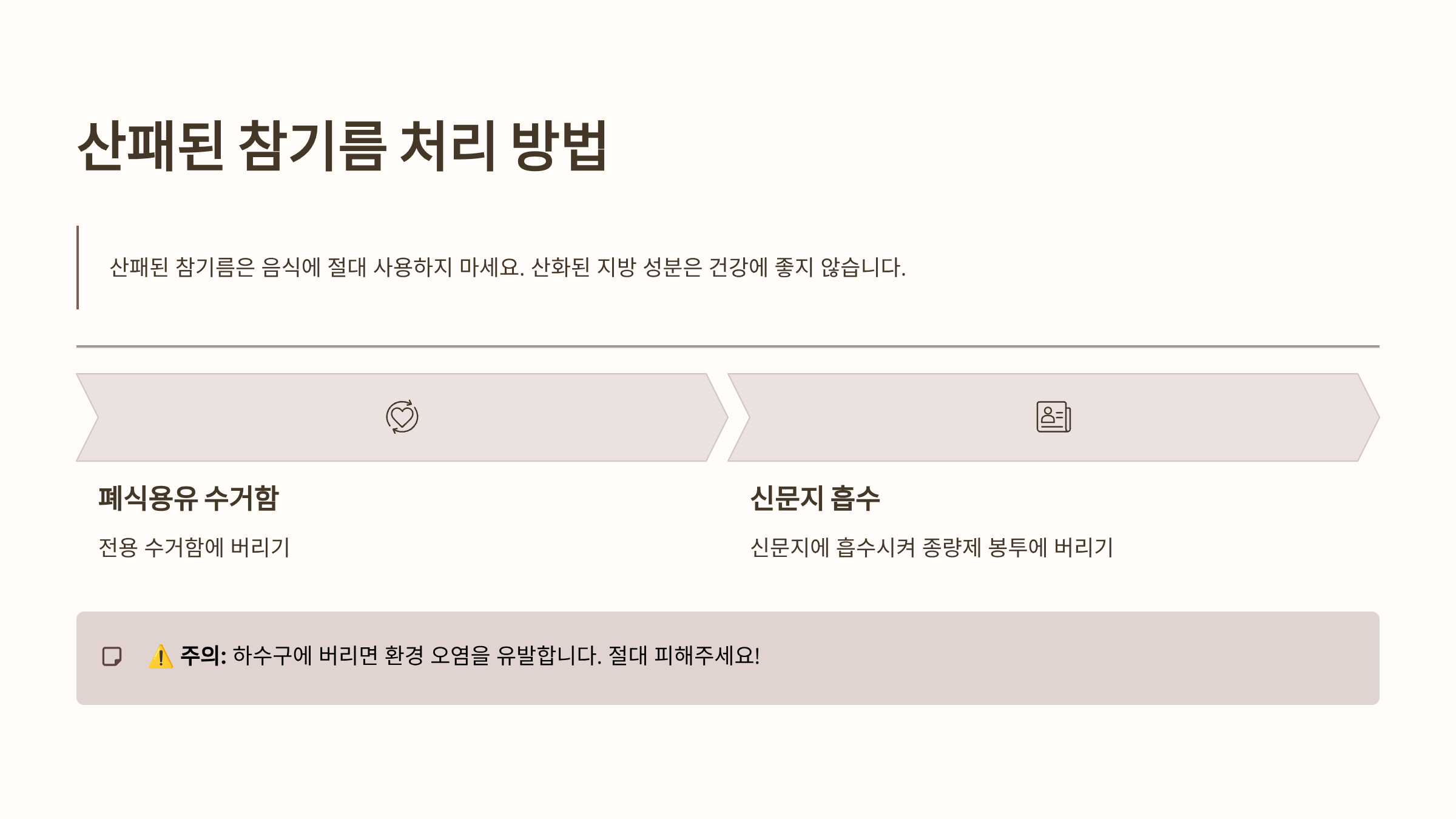 - 처리 방법: 산패된 참기름은 맛과 향이 변질되었을 뿐만 아니라, 산화된 지방 성분이 건강에 좋지 않습니다. 음식에 사용하지 말고 폐식용유 전용 수거함에 버리거나, 신문지에 흡수시켜 일반 쓰레기(종량제 봉투)로 처리해야 합니다. 하수구에 버리면 환경 오염을 유발하므로 절대 피해야 합니다.