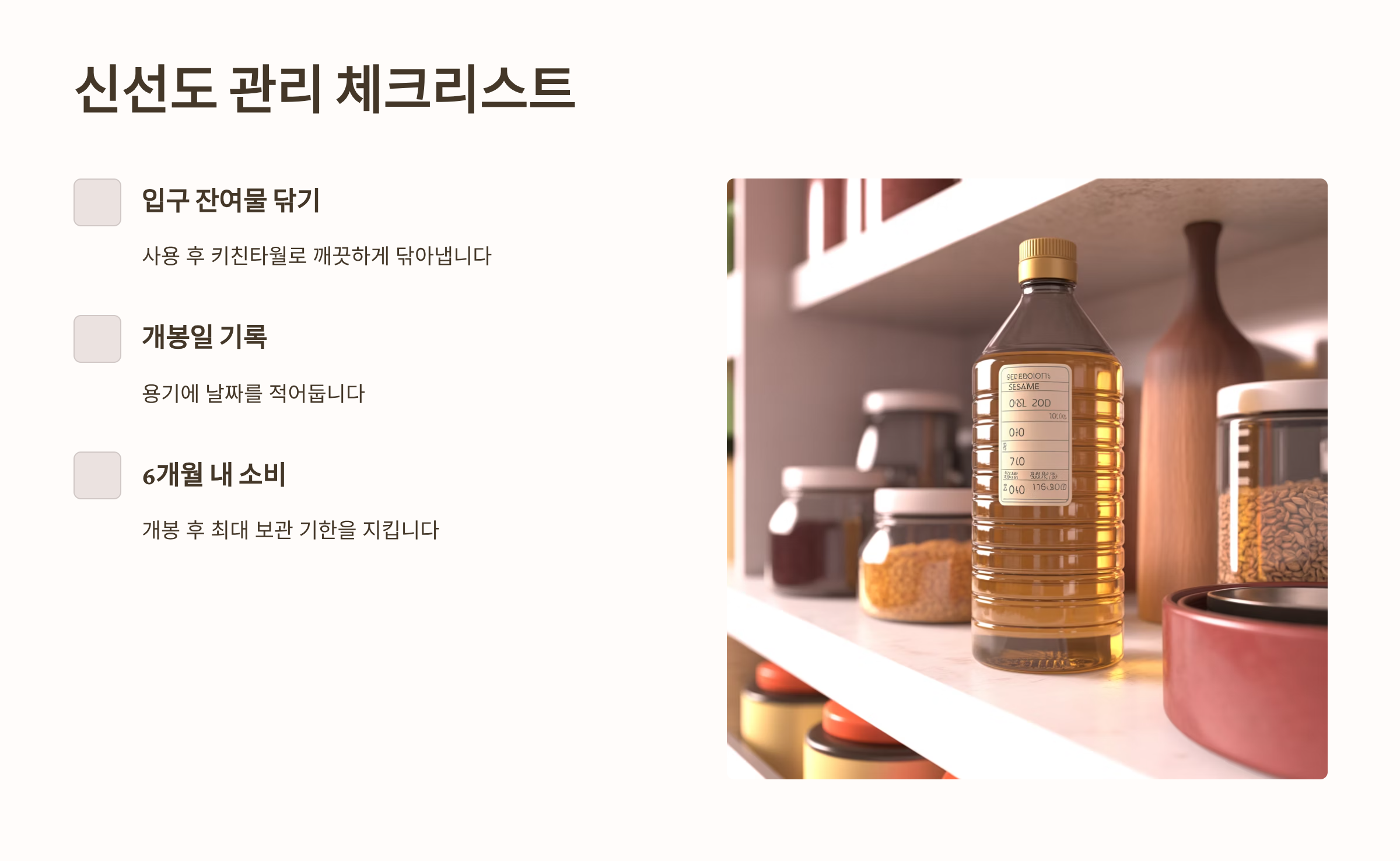 - 사용 후 잔여물 관리: 참기름을 따를 때 용기 입구에 묻은 잔여물이 산화되어 냄새를 유발할 수 있습니다. 사용 후에는 입구를 깨끗한 키친타월로 닦아내고 밀봉하는 습관이 중요합니다.