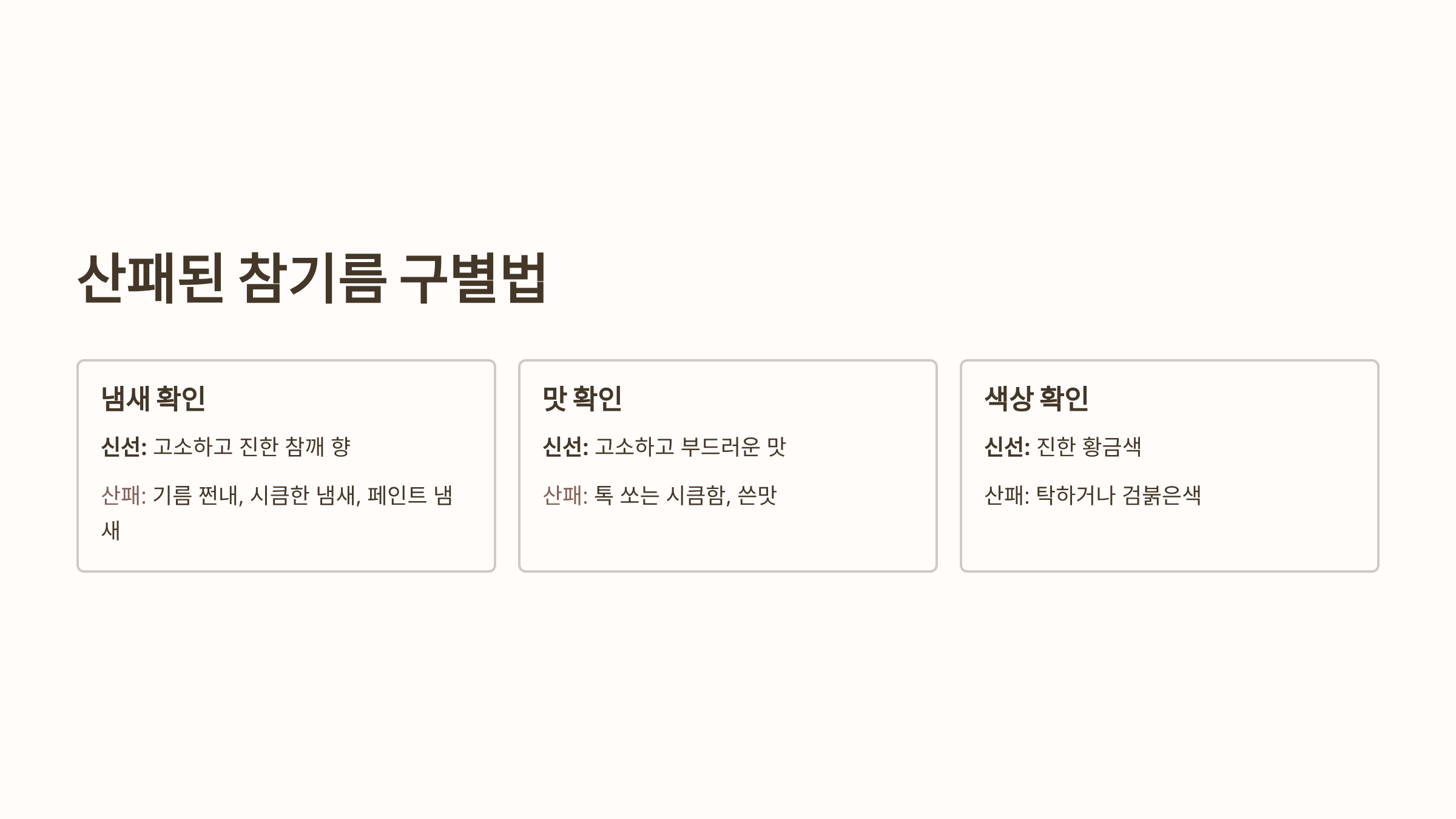 - 맛의 변화: 산패된 참기름은 고소한 맛이 사라지고 톡 쏘는 듯한 시큼하거나 씁쓸한 맛이 느껴집니다.