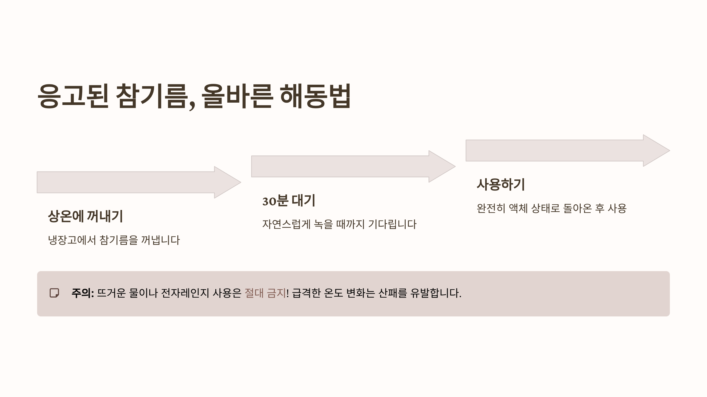 - 올바른 해동 방법: 참기름이 응고되었다면, 사용 전 상온에 30분 정도 두어 자연스럽게 녹여 사용합니다. 급격한 온도 변화는 산패를 유발할 수 있으므로, 뜨거운 물에 담그거나 전자레인지를 사용하는 것은 피해야 합니다.