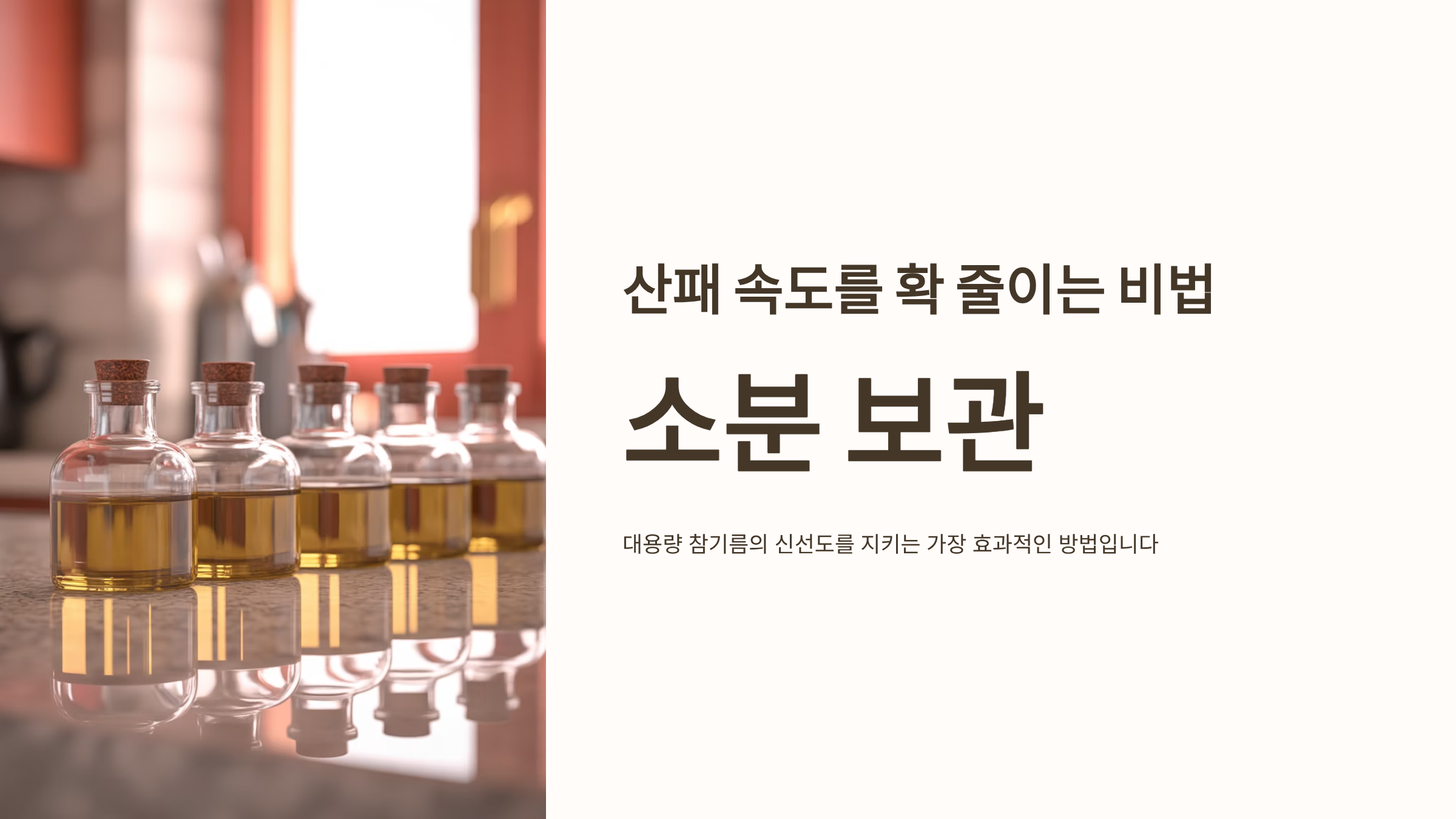 대용량 참기름을 사용하는 경우, 산패의 주요 원인인 공기 접촉을 최소화하여 산패 속도를 획기적으로 늦출 수 있는 실용적인 꿀팁입니다.