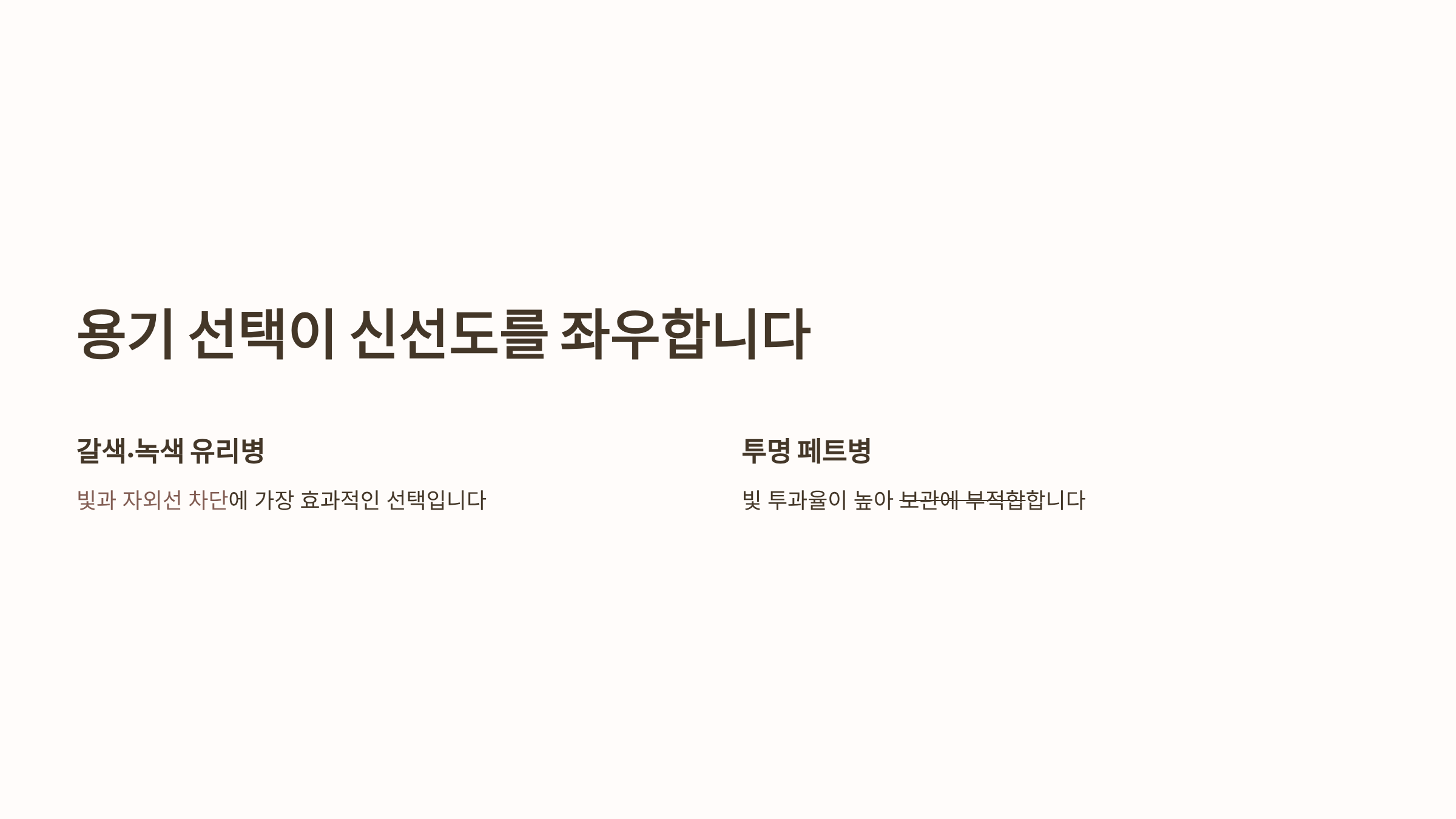 - 용기 선정 (불투명한 용기): 참기름은 반드시 어두운 색의 유리병에 보관해야 합니다. 갈색이나 녹색 계열의 불투명한 유리는 빛과 자외선 투과를 막아 산패를 늦추는 데 가장 효과적입니다. 투명한 페트병 용기는 빛의 투과율이 높아 보관에 부적합하며, 반드시 어두운 곳에 두어야 합니다.