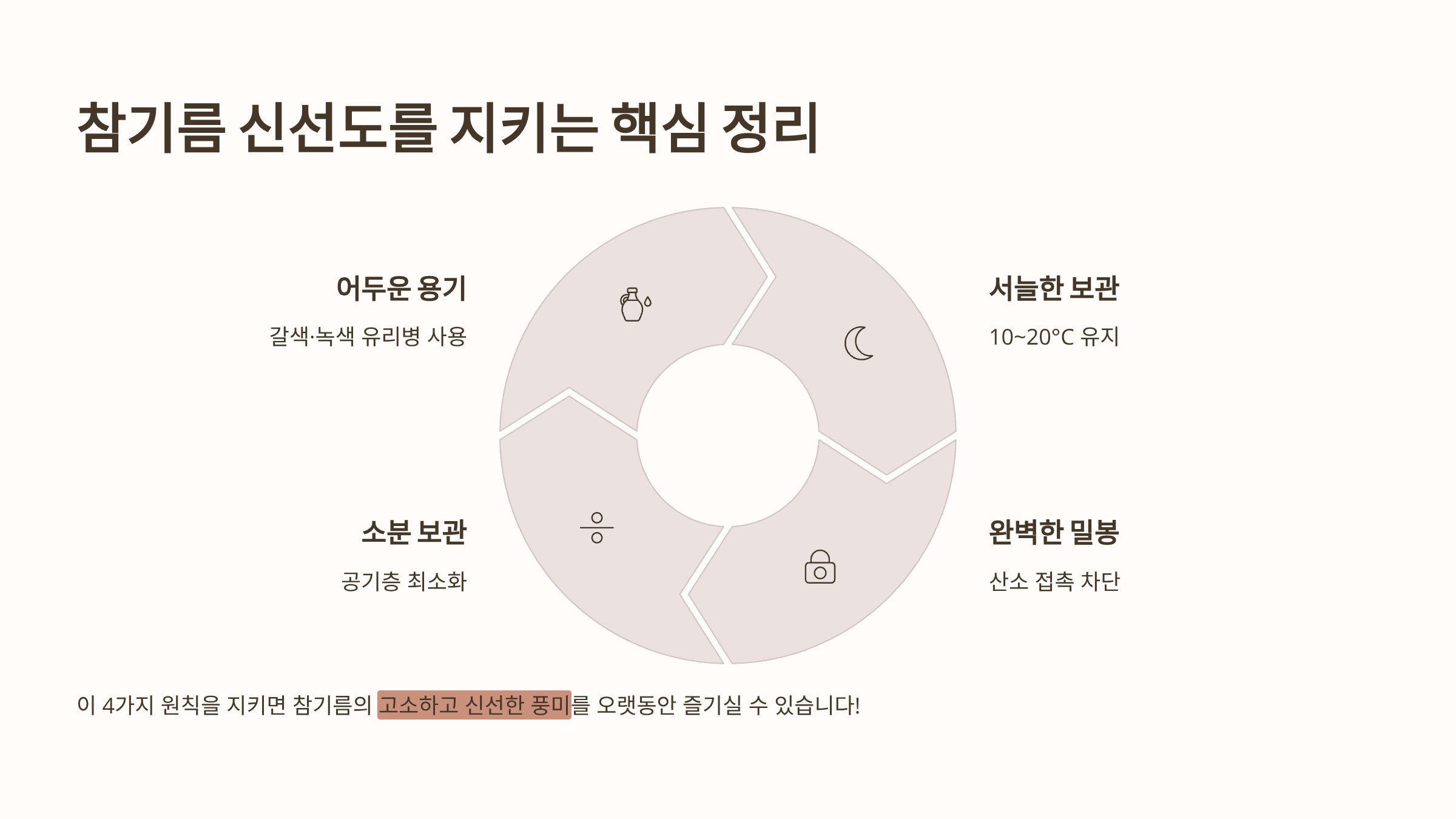 산패의 주요 원인인 빛, 열, 산소를 차단하는 것이 참기름 보관법의 핵심입니다. 용기와 위치 선정에 특별히 신경 써야 합니다.