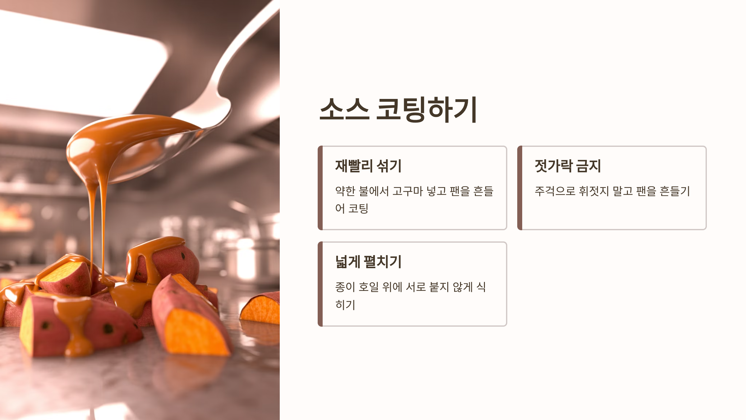 - 뭉침 방지 (젓가락 금지): 시럽에 고구마를 넣은 후에는 주걱이나 젓가락으로 휘젓지 않고, 팬을 잡고 재빨리 흔들어서 고구마가 서로 부딪히게 하여 코팅을 입혀야 고구마가 부서지거나 소스가 뭉치는 것을 방지할 수 있습니다.
