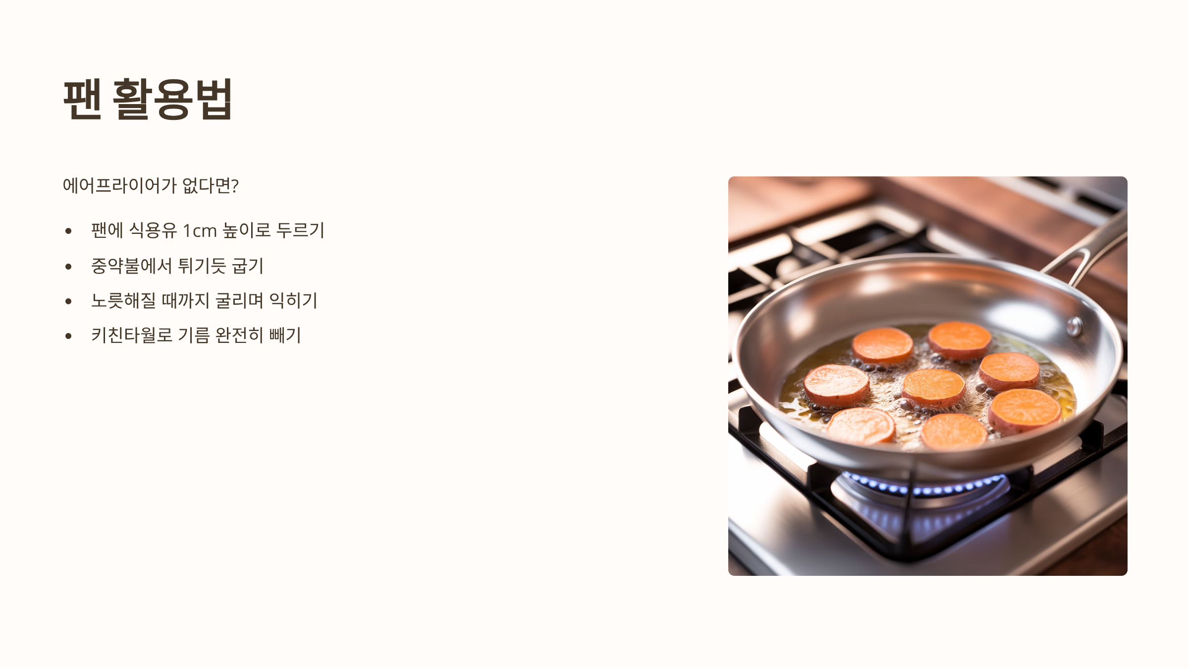 - 팬 활용 (오일 구이): 에어프라이어가 없다면 프라이팬을 이용합니다.