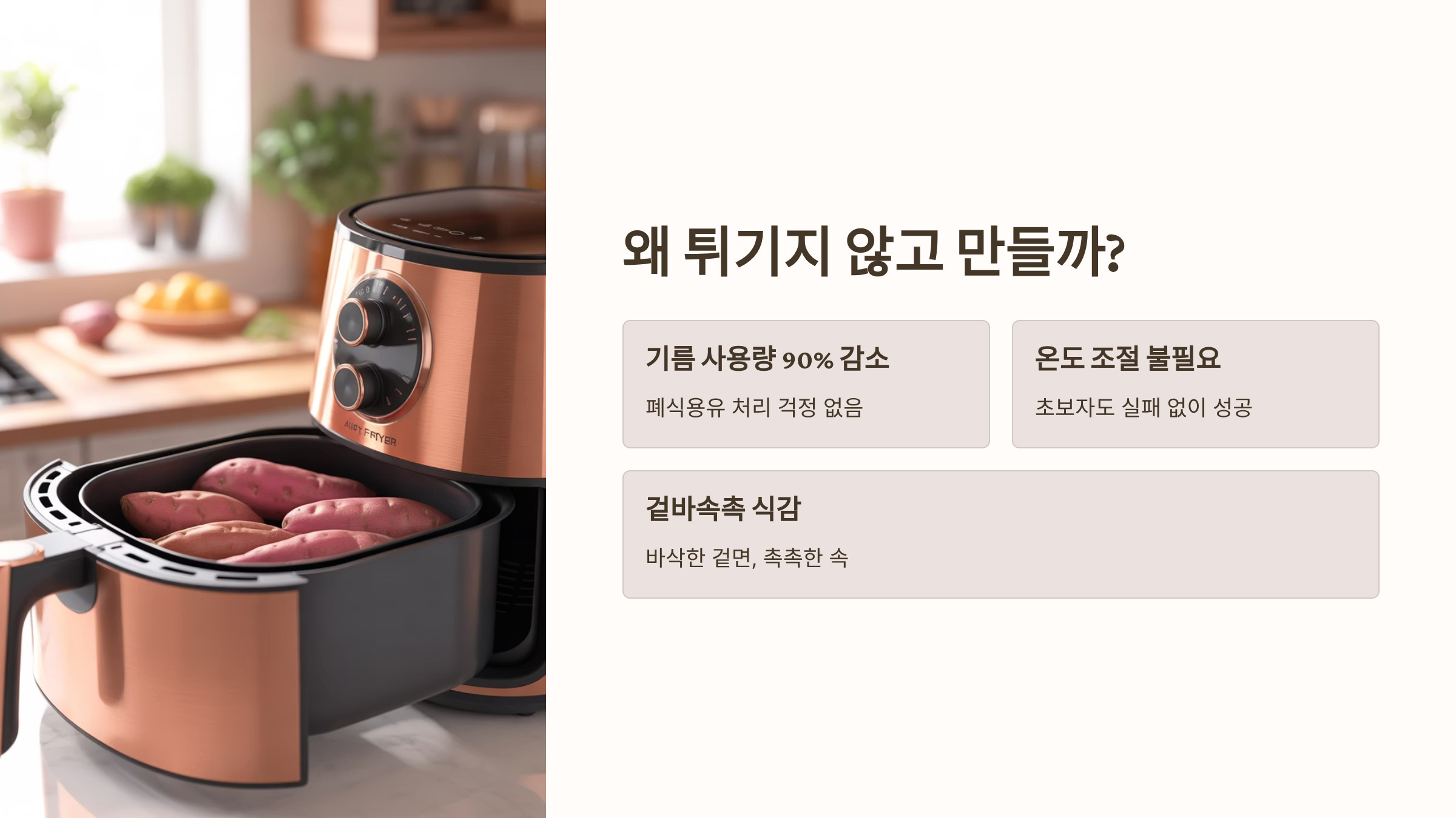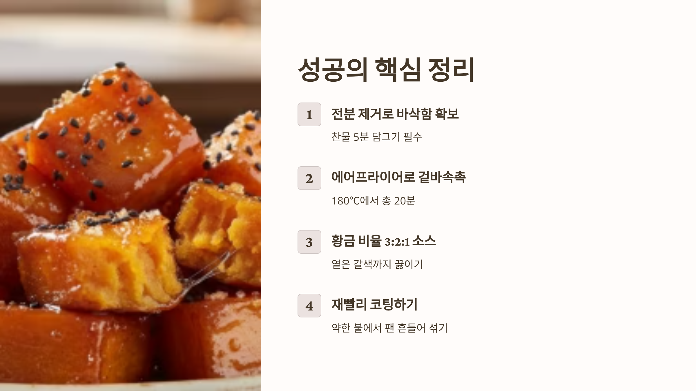 이 방법을 사용하면 기름 사용량을 90% 이상 줄이면서도 겉은 바삭하고 속은 촉촉한 '겉바속촉' 맛탕을 만들 수 있습니다. 이 포스팅은 초보자도 실패 없이, 튀기지 않고 윤기 나는 바삭한 맛탕을 만드는 초간단 레시피를 단계별로 상세히 안내하겠습니다.