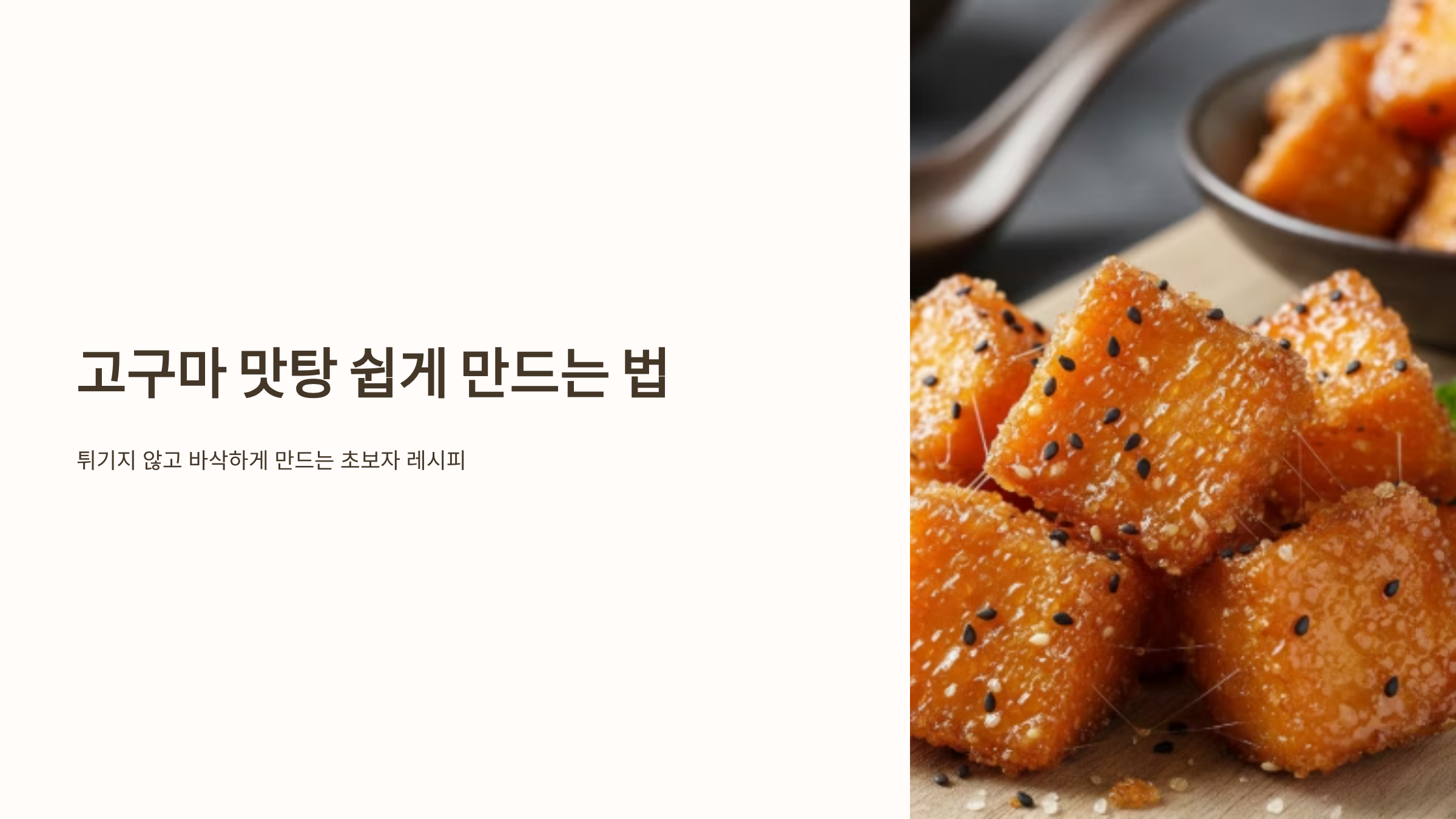 이번에 소개해드릴 고구마 맛탕 레시피는 초보자도 쉽게 따라 할 수 있는 튀기지 않고 바삭하게 만드는 고구마 맛탕 황금레시피를 공개합니다. 에어프라이어 또는 팬을 이용해 고구마를 겉바속촉으로 굽는 노하우와, 맛탕이 딱딱하게 굳거나 끈적거리지 않고 윤기를 내는 황금 소스 비율을 상세히 안내합니다.