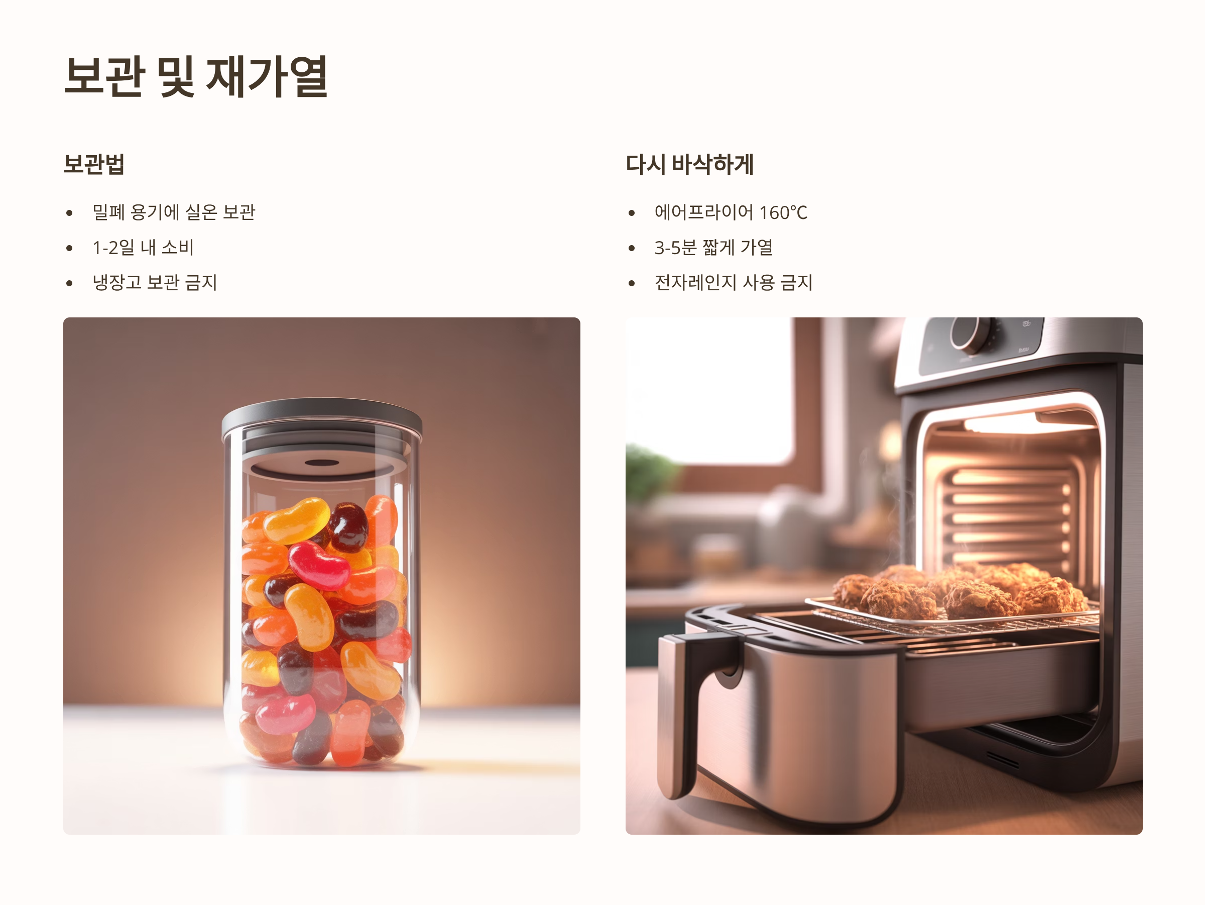- 전자레인지 금지: 전자레인지를 사용하면 수분이 다시 생겨 맛탕이 끈적거리고 물렁해지므로 사용하지 않습니다.