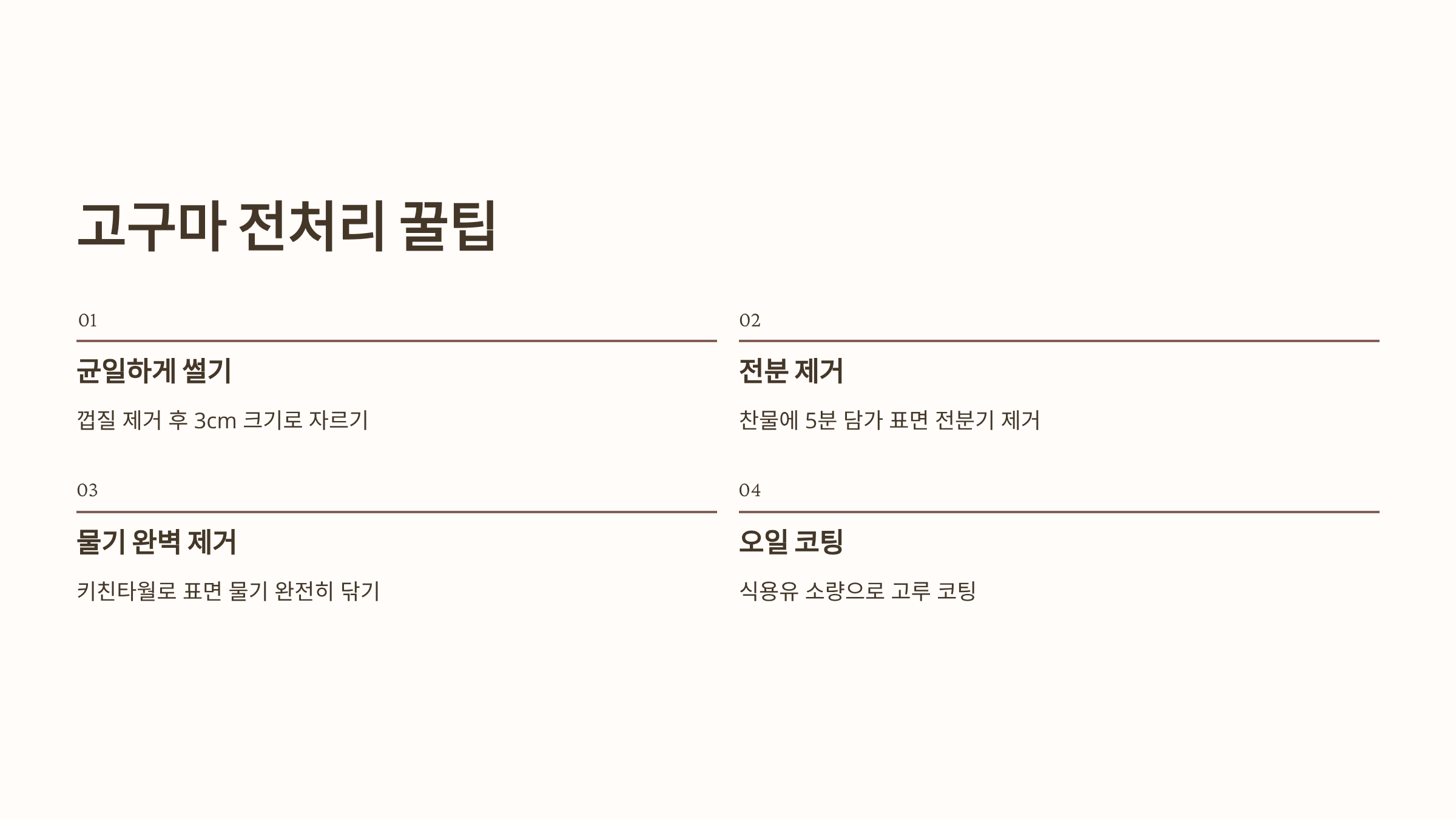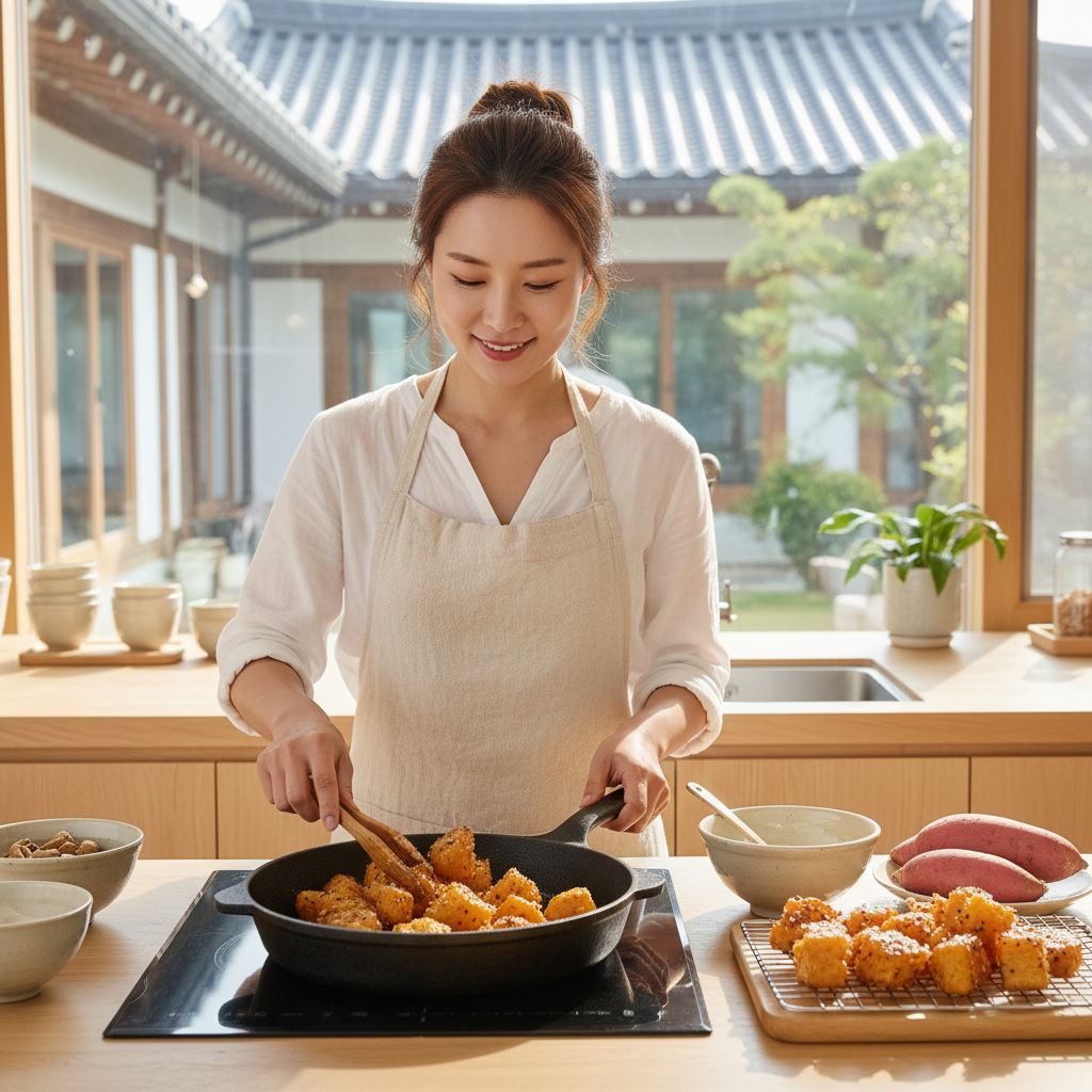 - 오일 코팅: 물기를 제거한 고구마에 소량의 식용유를 코팅하여 굽는 과정은 튀기지 않는 맛탕의 바삭함을 보장하는 핵심 단계입니다.