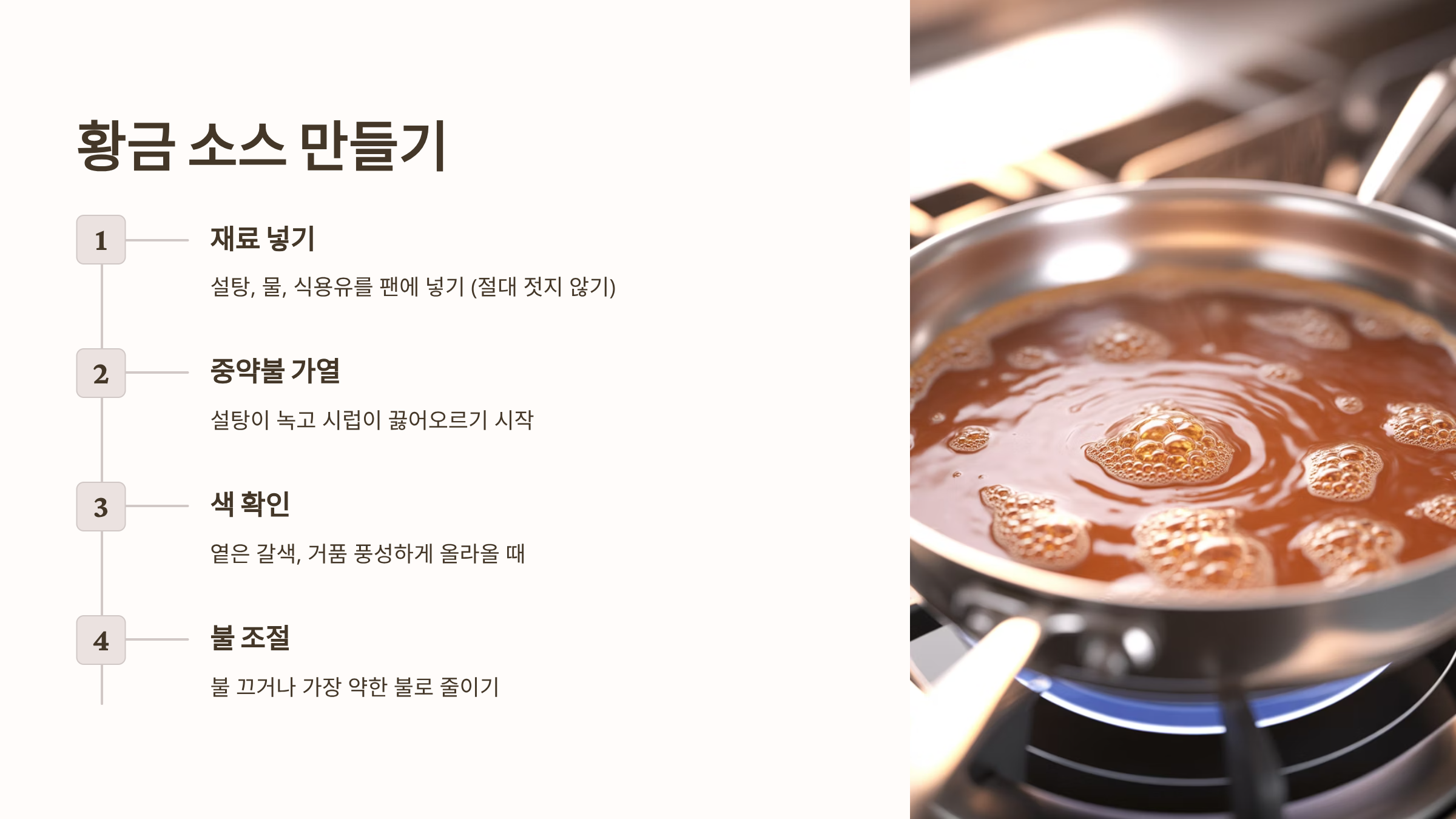 - 끈적거림 방지 (시럽 비율): 물과 설탕의 비율이 맞지 않거나, 시럽을 충분히 끓이지 않고 불을 끄면 나중에 물엿처럼 끈적거리는 상태가 됩니다. 반드시 시럽을 넣고 옅은 갈색이 돌 때까지 끓여줘야 점성이 생겨 코팅이 잘 됩니다.