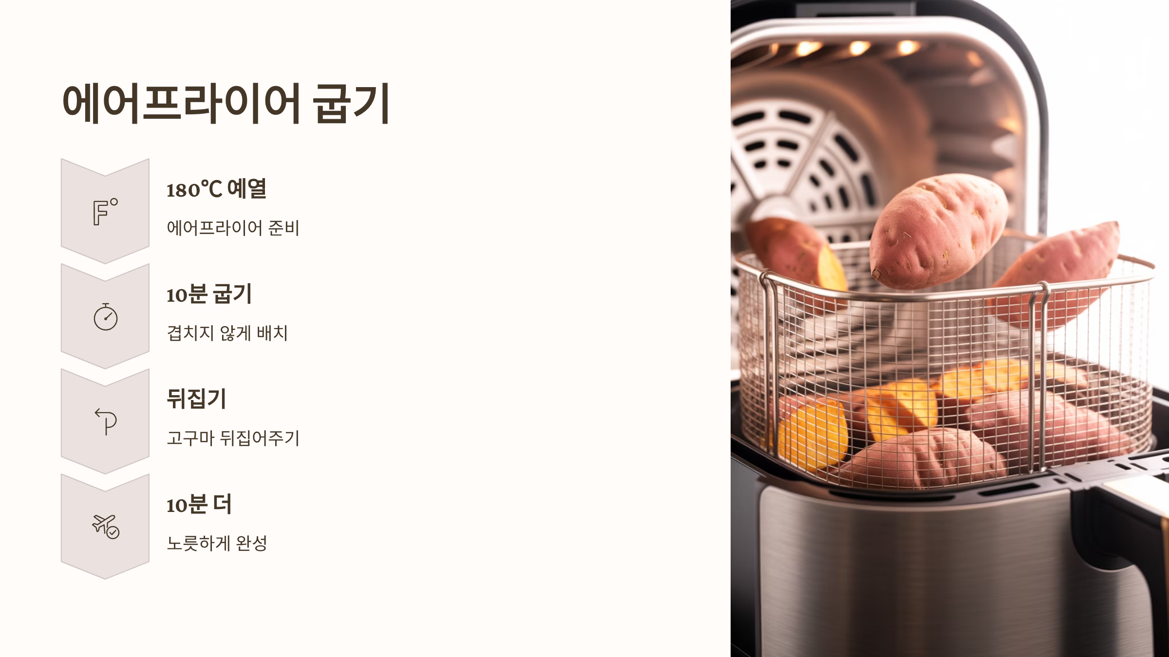 - 에어프라이어 활용 (가장 추천): 고구마를 튀긴 것과 같은 식감으로 익히는 가장 쉽고 깔끔한 방법입니다.