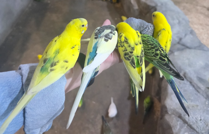 손에 사료를 주고 앵무새들이 다가오는 모습에