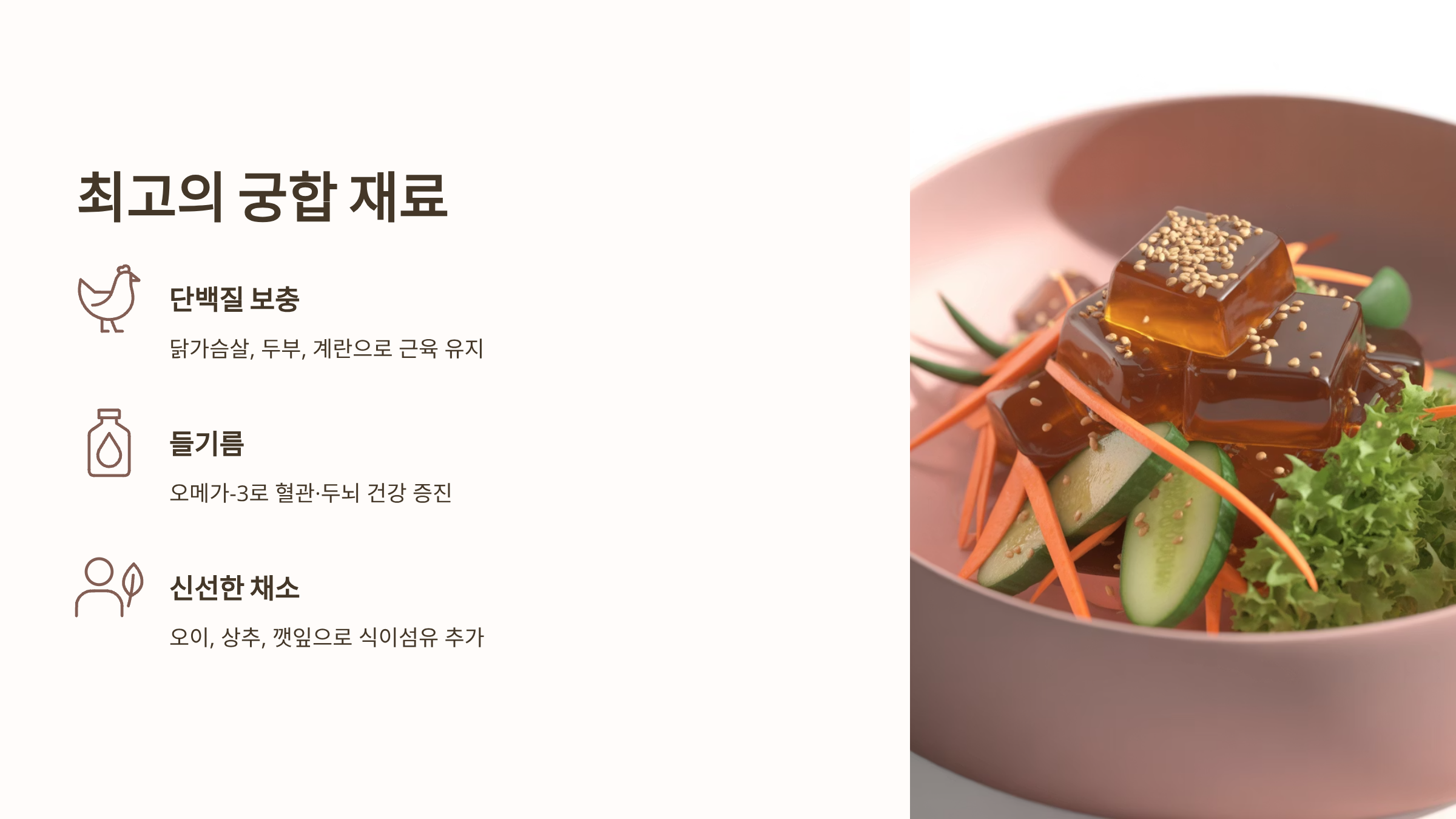 - 들기름 (오메가-3): 도토리묵을 무칠 때 들기름을 사용하면 향긋한 풍미를 더할 뿐만 아니라, 부족한 오메가-3 지방산을 보충하여 혈관 건강과 두뇌 건강 효능을 극대화할 수 있습니다.