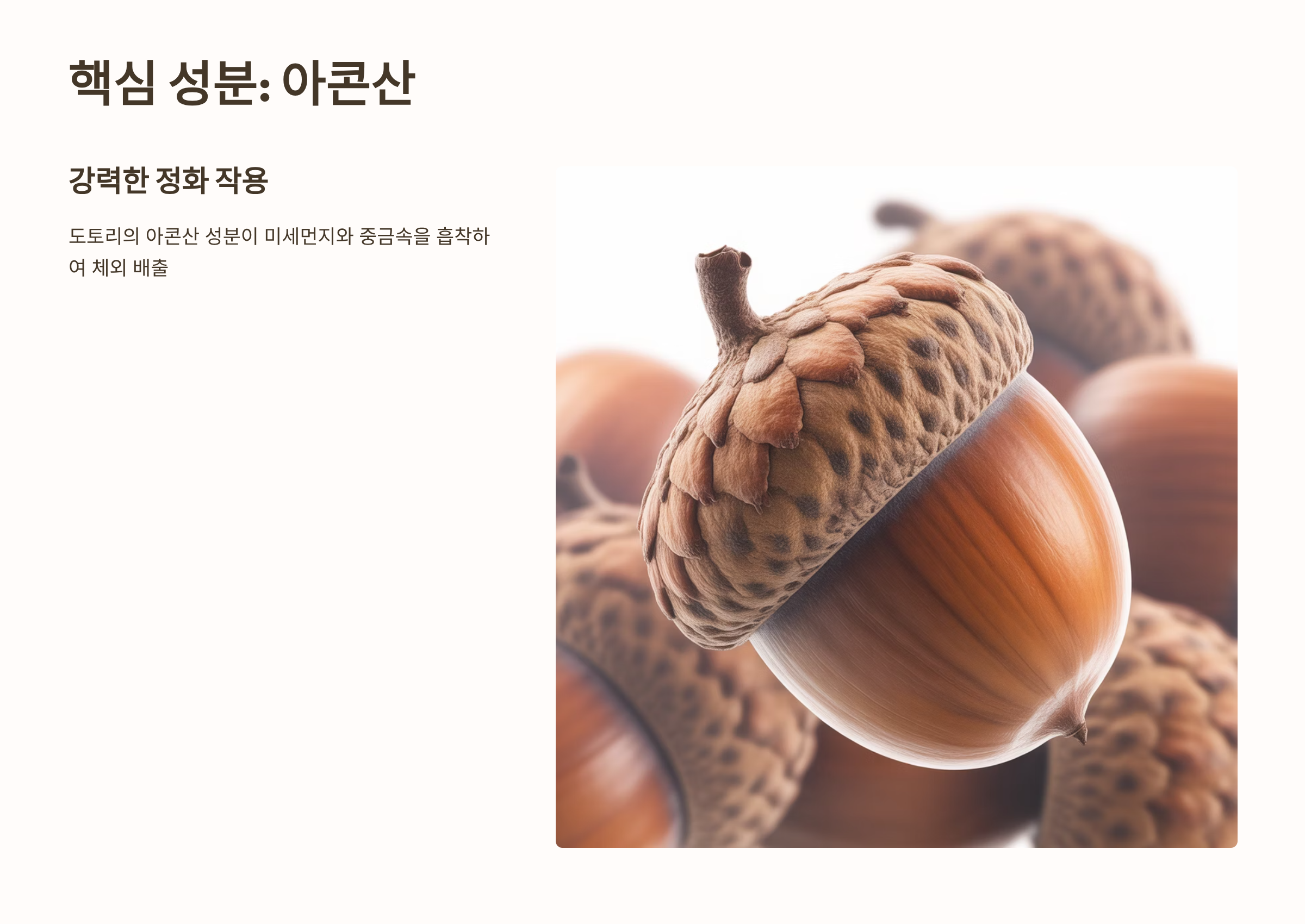- 아콘산의 정화 작용: 아콘산(Acorn Acid)은 도토리 속의 타닌 성분과 유사한 물질로, 강력한 흡착력을 가지고 있습니다. 섭취 시 아콘산이 소화 기관을 통과하면서 미세먼지나 중금속, 환경호르몬 등의 유해 물질을 흡착하여 대변을 통해 체외로 배출하는 것을 돕습니다.