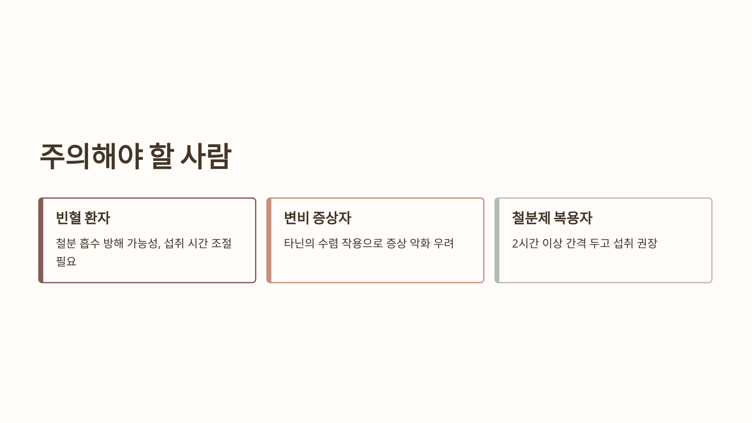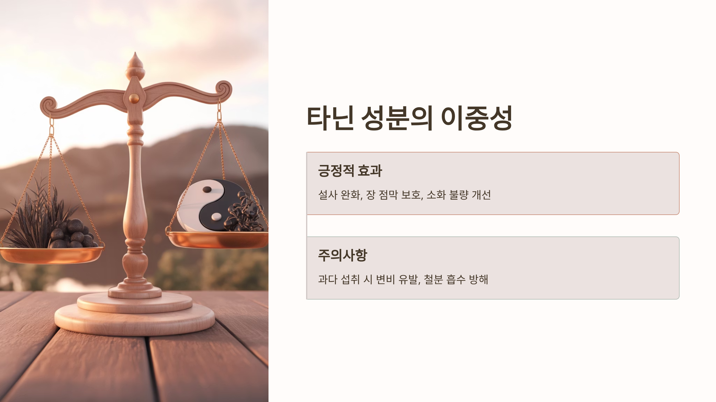 - 타닌의 부작용 (변비 및 철분 흡수 방해): 타닌 성분은 장 점막을 수축시키는 수렴 작용이 강하므로, 과다 섭취 시 변비를 유발할 수 있습니다. 또한, 타닌은 철분과 결합하여 철분 흡수를 방해하는 성질이 있습니다.