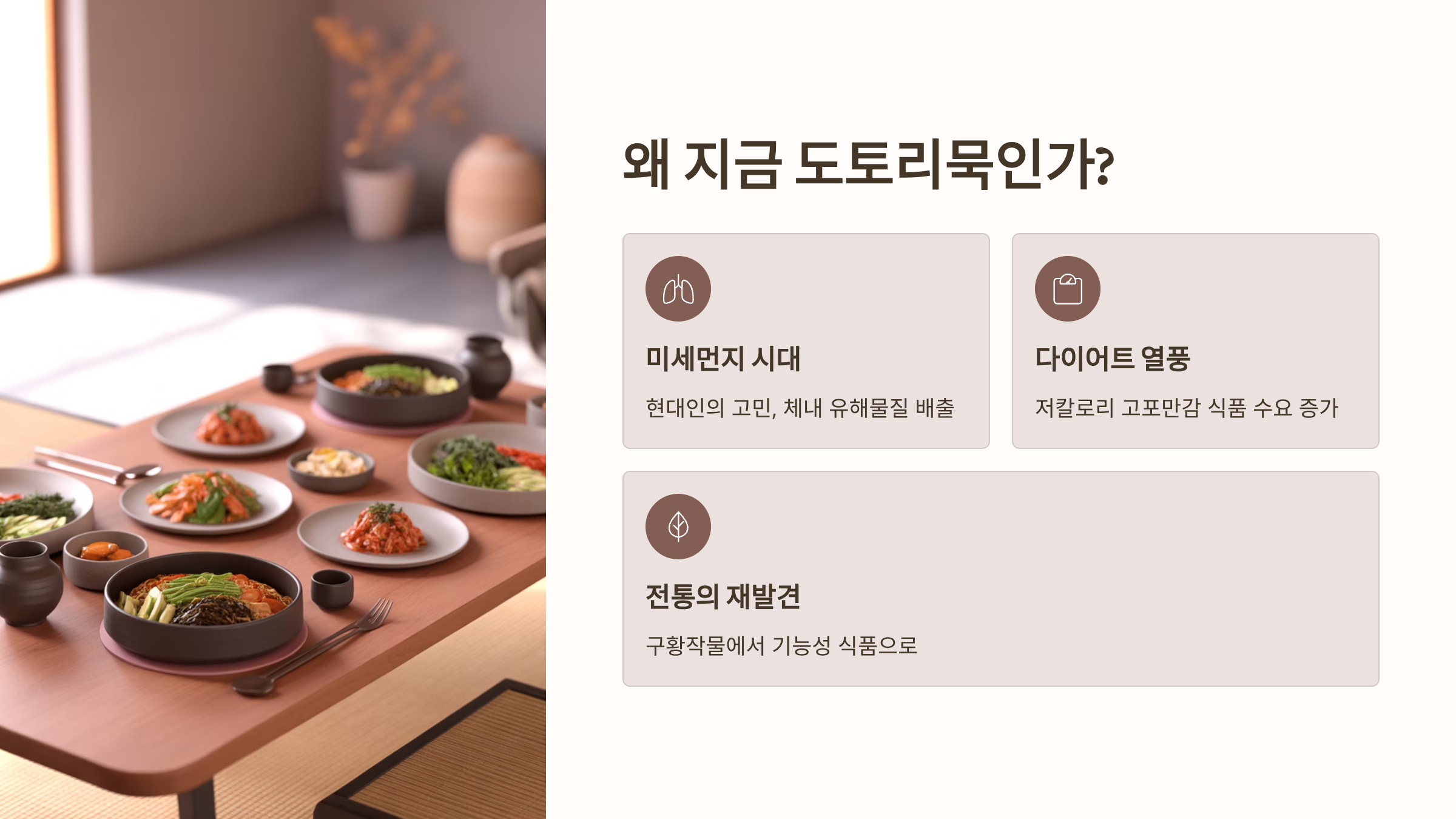 요즘 미세먼지가 심해지고 있는데 도토리묵의 핵심 성분인 아콘산이 미세먼지와 중금속을 흡착하여 배출하는 원리를 과학적으로 분석합니다. 낮은 칼로리와 높은 포만감으로 체지방 감소에 기여하는 다이어트 효과를 설명하고, 도토리묵의 타닌 성분을 안전하게 섭취하는 노하우를 안내합니다. 마지막으로, 도토리묵 효능을 극대화하고 맛을 살리는 최고의 궁합 재료까지 제시합니다.