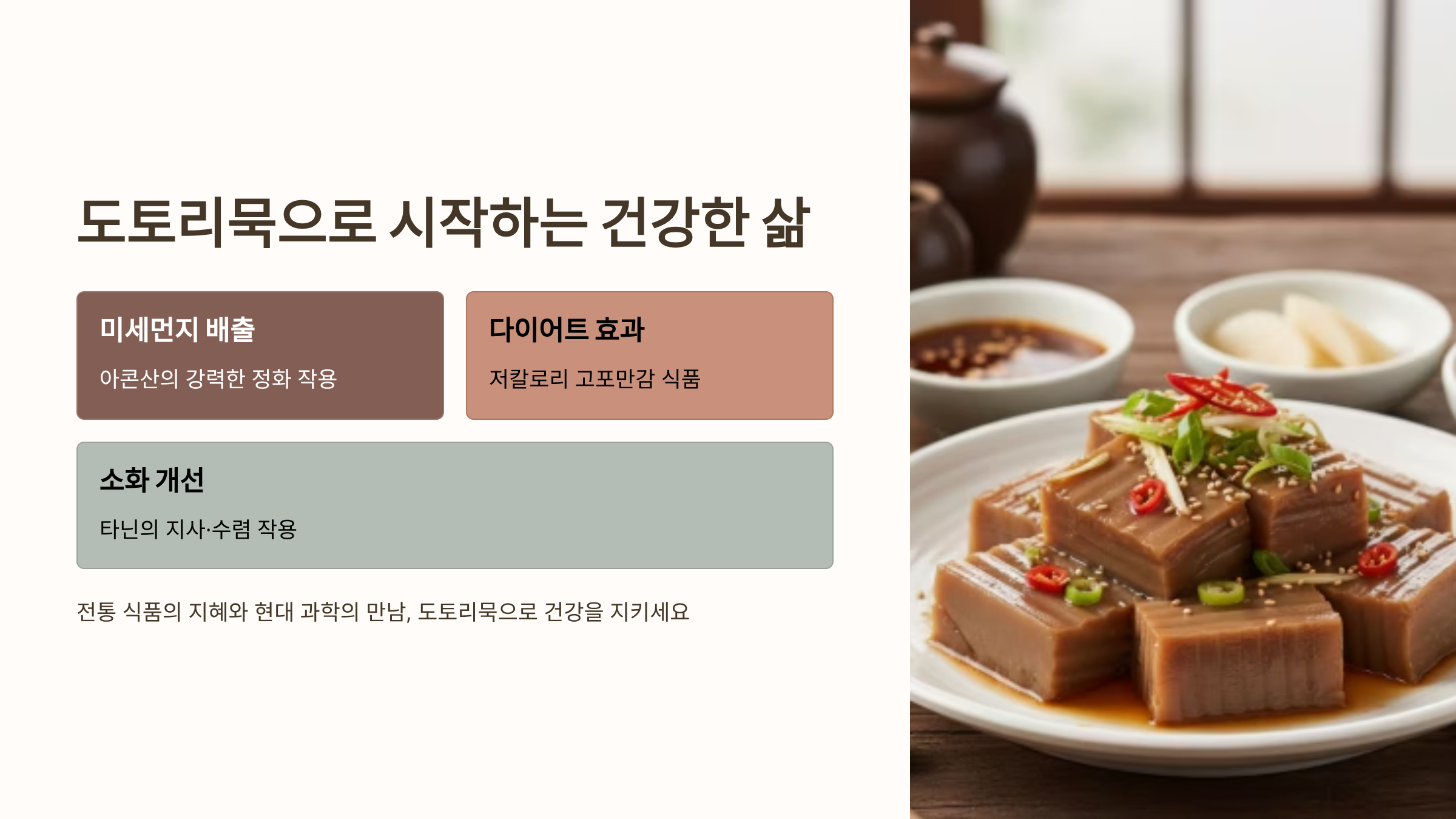 도토리묵은 한국의 전통적인 건강식으로, 특유의 탱글탱글한 식감과 은은한 씁쓸한 맛이 매력적입니다. 예로부터 구황작물로 사용되어 온 도토리묵은 최근에는 다이어트 식품으로, 그리고 현대인의 고민인 미세먼지 배출에 도움을 주는 기능성 식품으로 재조명받고 있습니다. 당신이 지금 '도토리묵 효능'을 검색한 것은, 이 전통적인 식품이 가진 숨겨진 건강 효과와 그 과학적인 근거를 알고 싶기 때문일 것입니다. 이 포스팅은 도토리묵의 핵심 성분을 분석하여 몸속 노폐물 배출과 체지방 감소에 미치는 영향을 설명하고, 효능을 극대화하는 섭취 방법까지 상세히 안내하겠습니다.