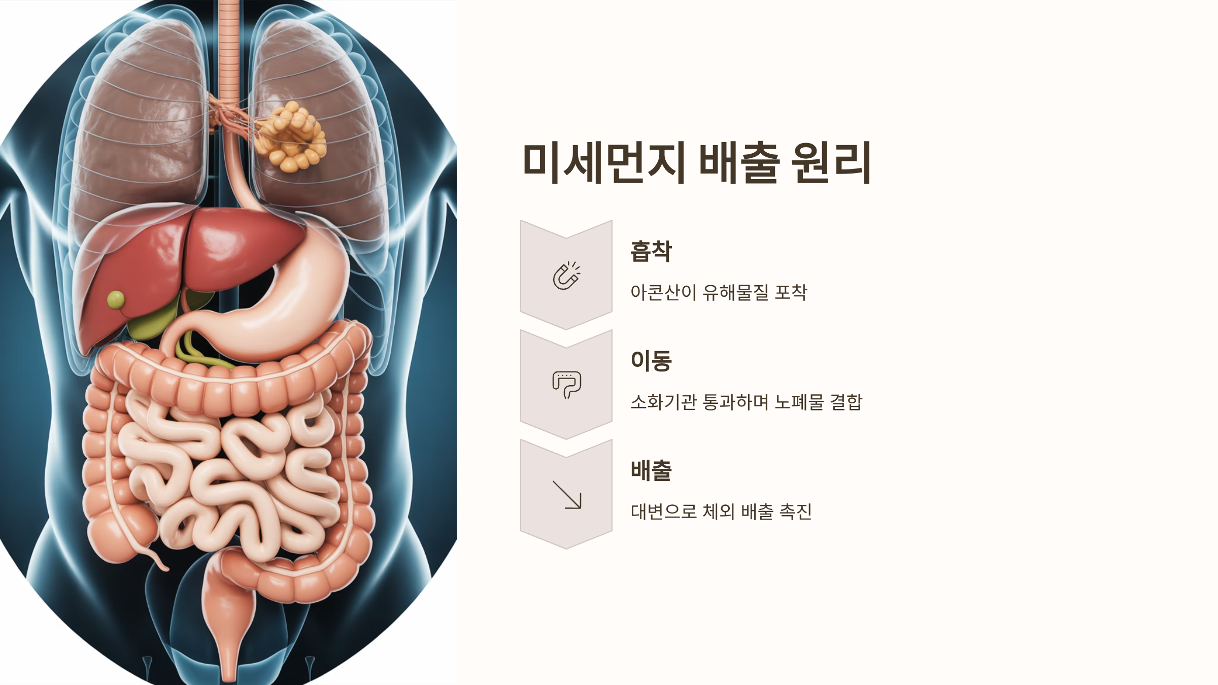 - 장내 노폐물 배출 촉진: 아콘산 외에 풍부한 식이섬유가 장 운동을 활발하게 하여 노폐물의 장내 체류 시간을 줄입니다. 장 운동의 활성화는 미세먼지나 중금속이 장벽을 통해 재흡수되는 것을 막고, 빠르게 체외로 밀어내는 데 기여합니다.