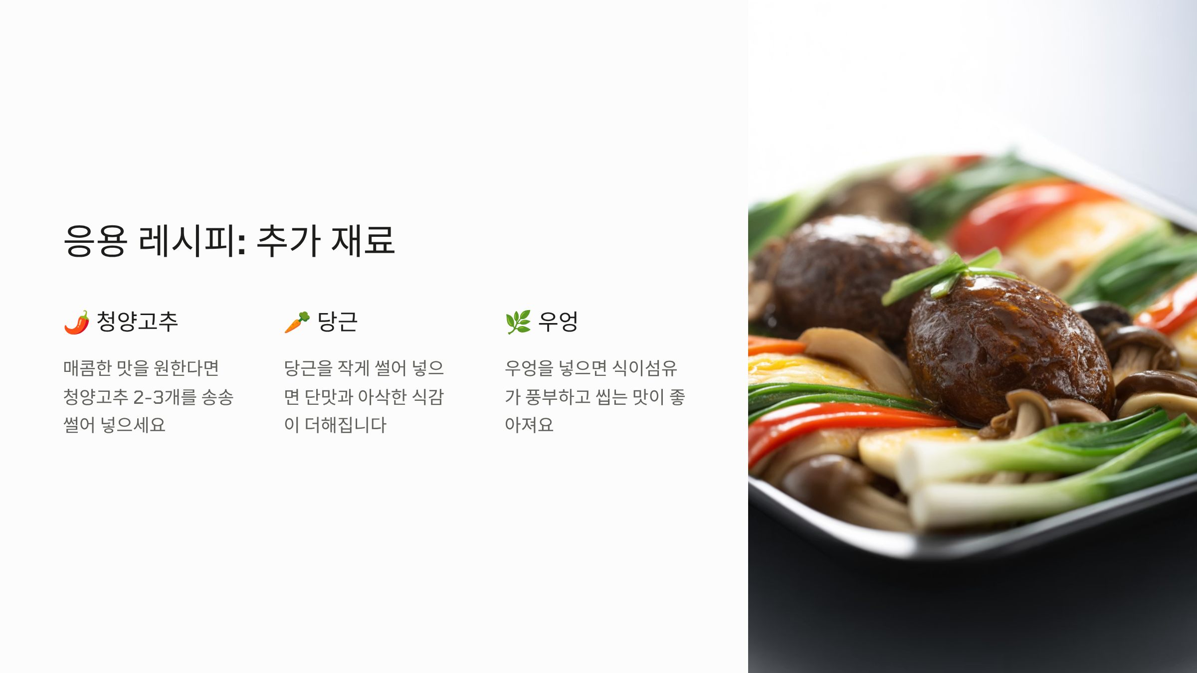 - 취향에 따라 청양고추, 당근, 우엉 등을 넣어 아삭한 식감을 더해도 좋습니다.