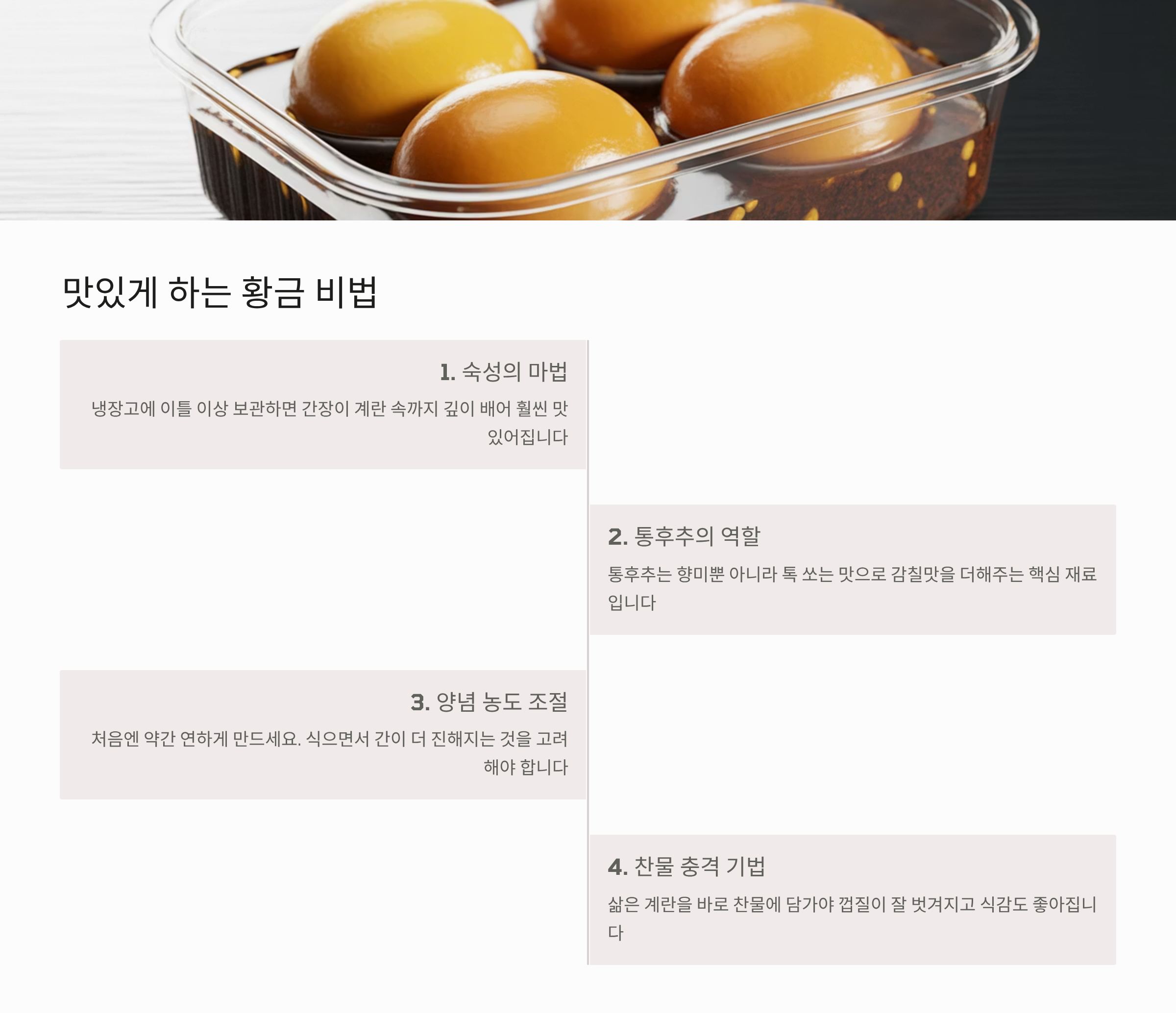 - 냉장 보관 시, 이틀 이상 숙성시키면 간장이 계란 깊숙이 잘 배서 훨씬 맛있어집니다.