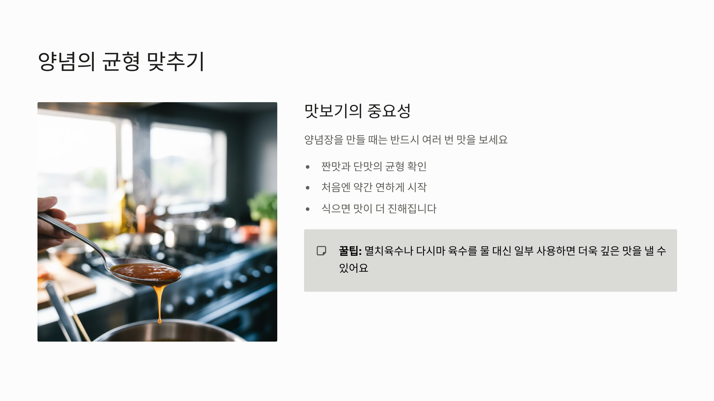 - 간장을 여러 번 맛보면서 짠맛 정도와 단맛 균형을 맞추는 것이 중요합니다.