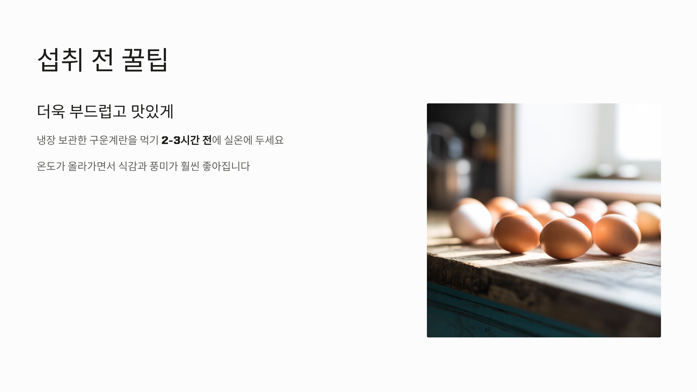 - 냉장 보관한 구운계란은 섭취 전 2~3시간 실온에 두면 더욱 부드럽고 맛있게 즐길 수 있습니다.