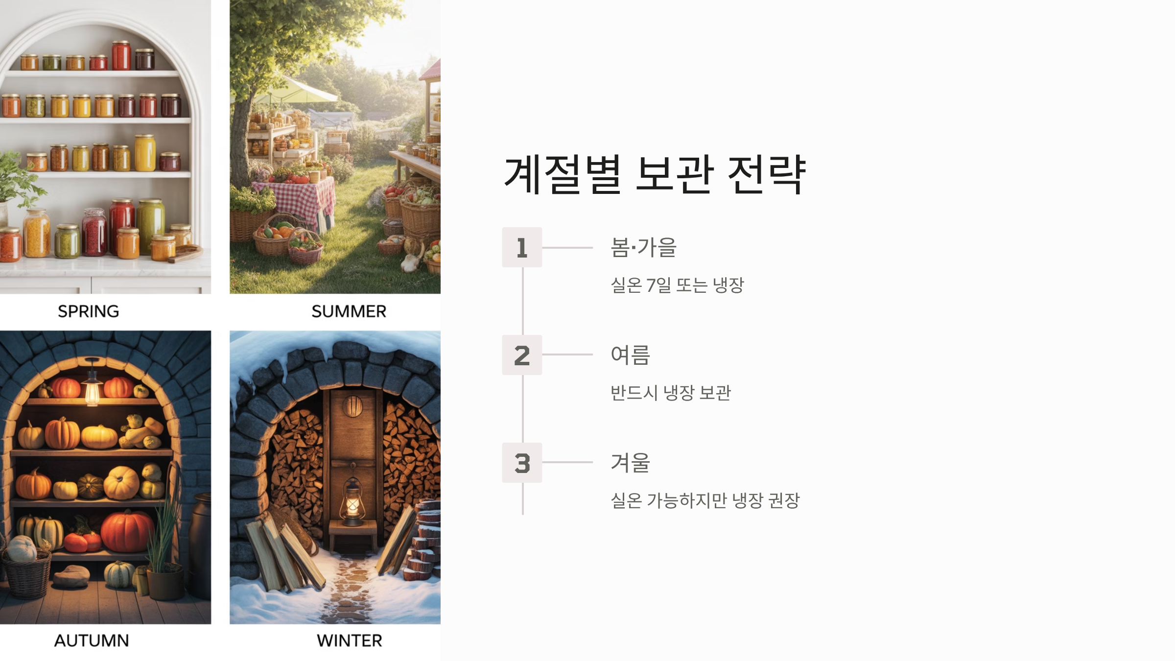 - 온도가 높아지는 여름철에는 실온 보관을 피하고 냉장을 권장합니다.