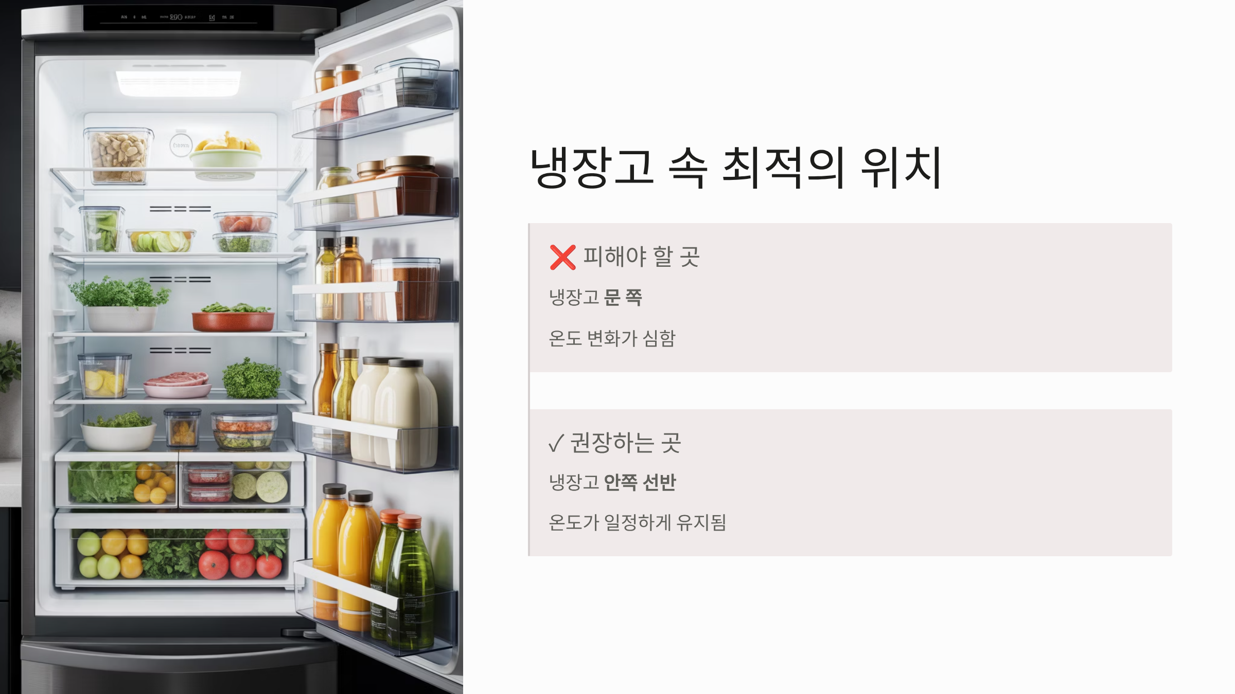 - 냉장고 문 쪽보다 온도가 일정한 안쪽 공간에 보관하면 온도 변화로 인한 품질 저하를 막을 수 있습니다.