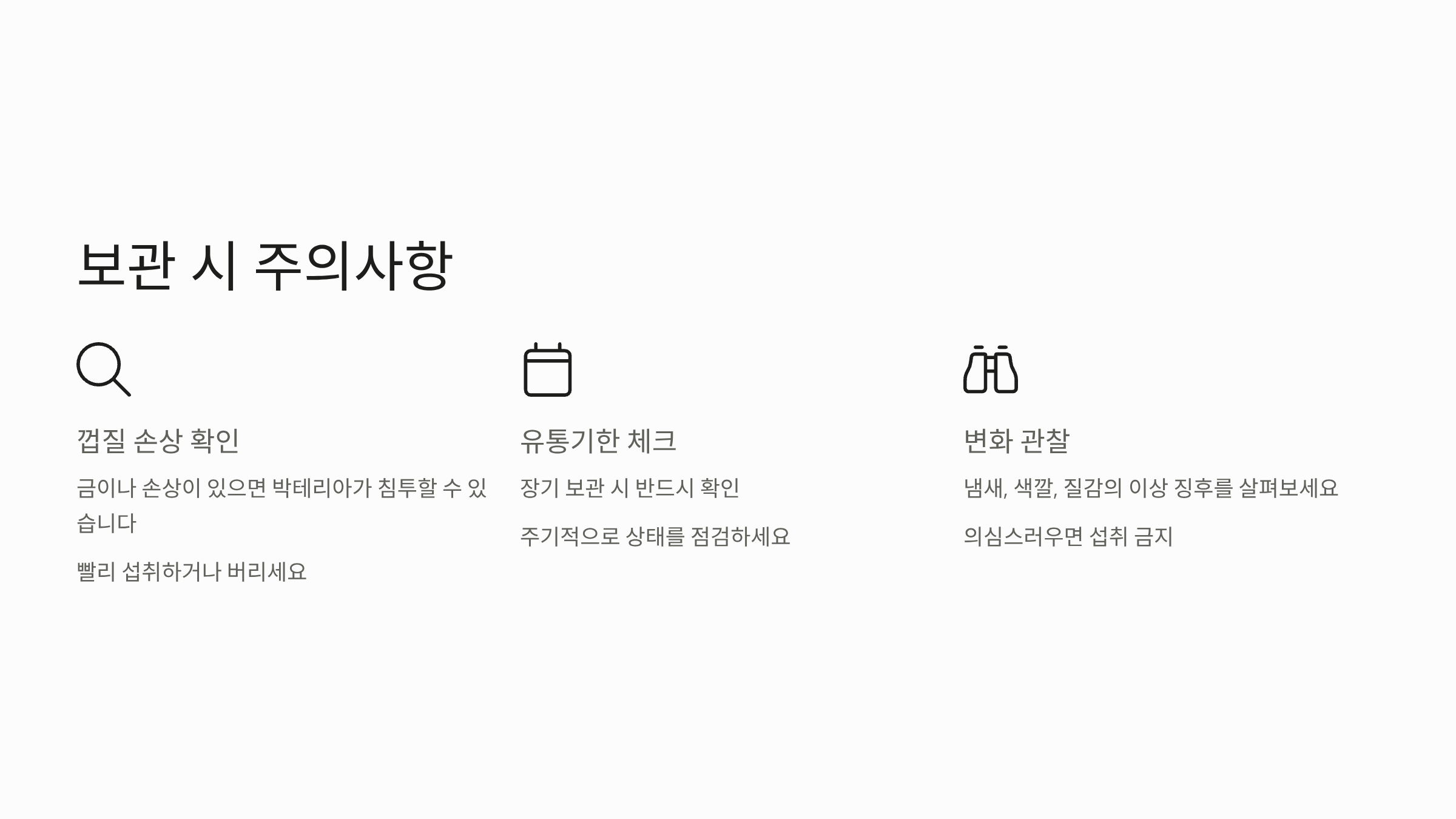 - 보관 후 이상 징후가 있을 경우 섭취하지 않는 것이 가장 안전합니다.