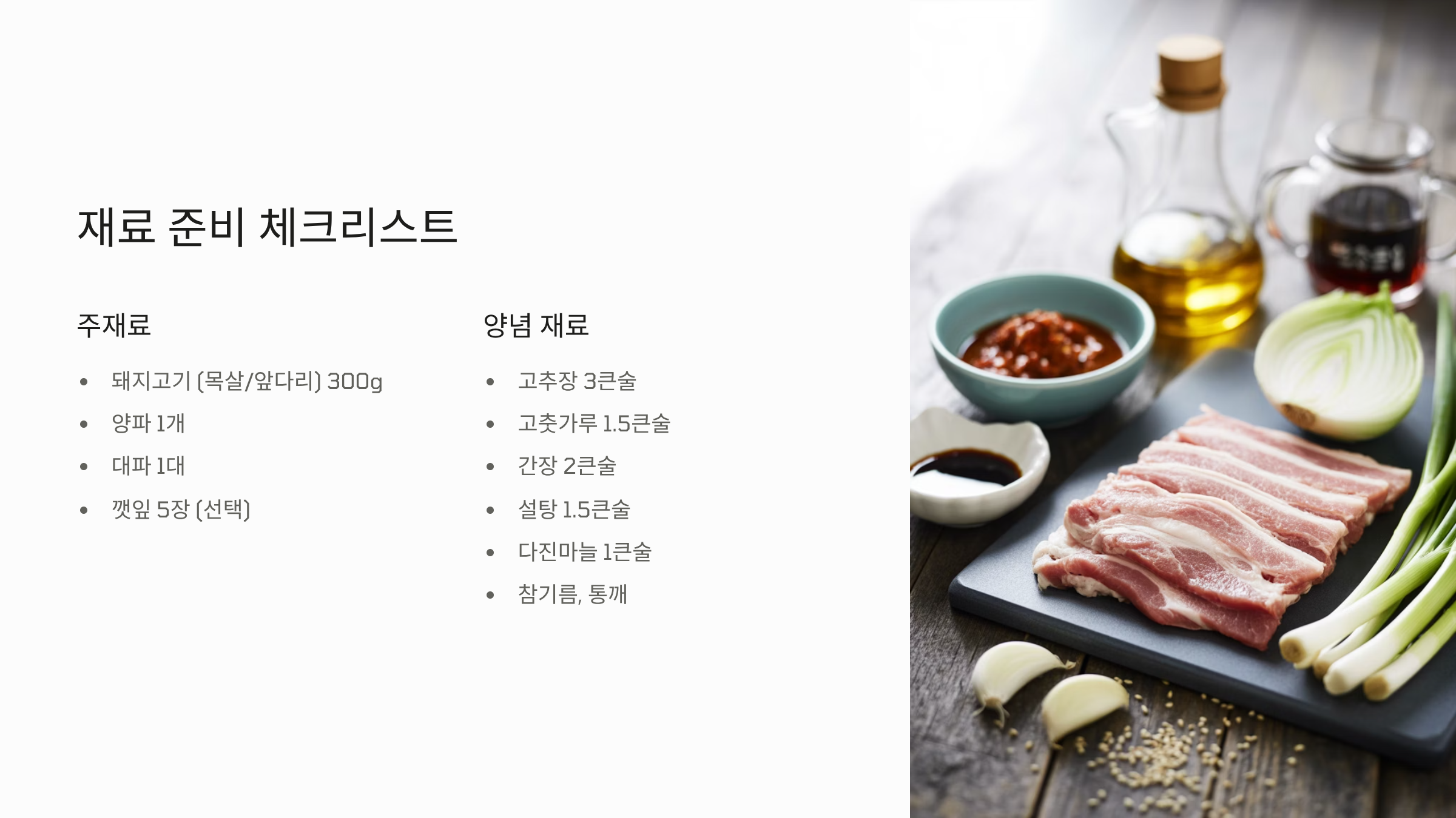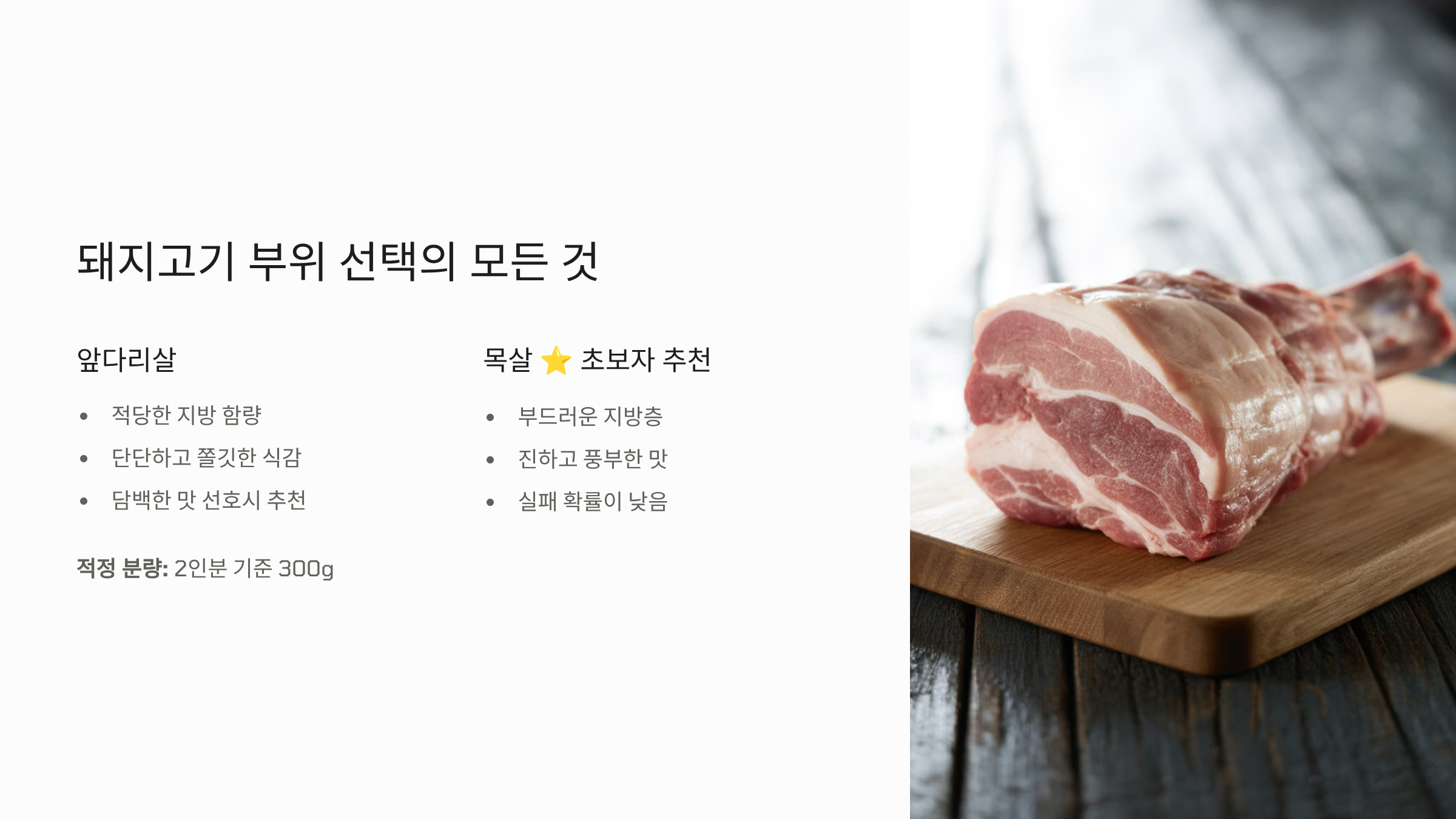 앞다리살은 적당한 지방과 단단한 식감, 목살은 부드러운 지방층이 많아 더 진한 맛을 냅니다. 초보자는 목살 추천. 분량은 300g 정도가 2인분 적당. - 얇게 썰기