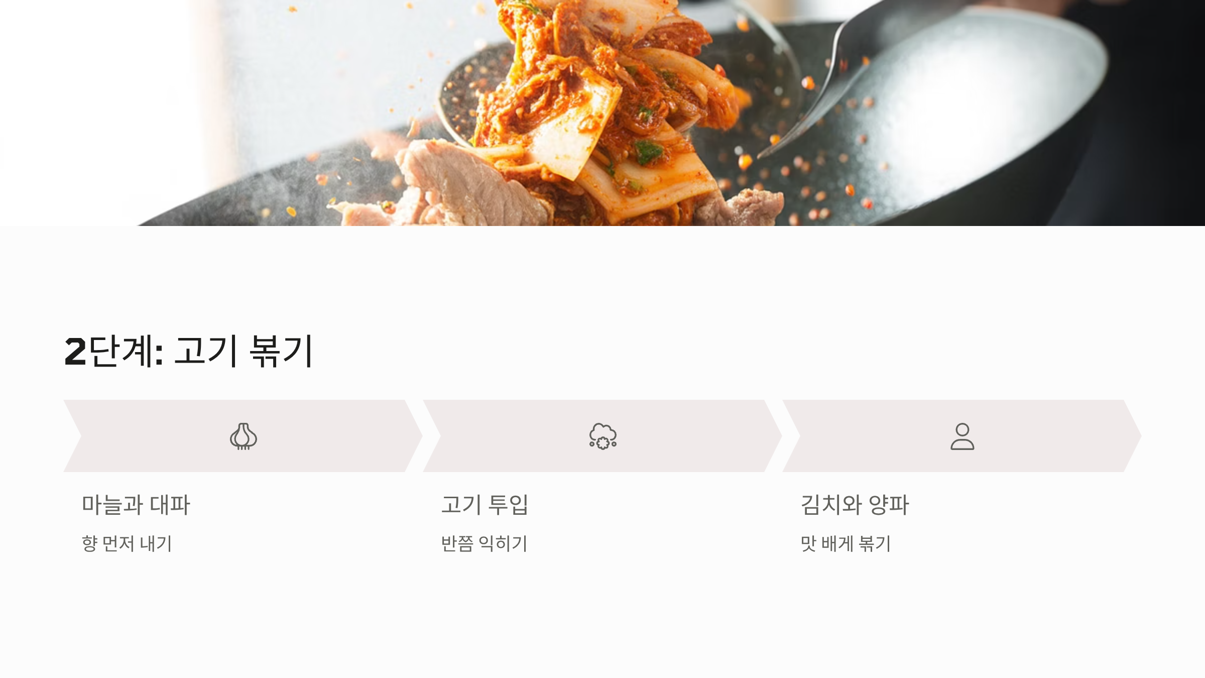 - 고기가 반쯤 익으면 양파와 김치를 넣고 같이 볶아 김치의 맛과 향을 고기에 잘 배게 합니다.