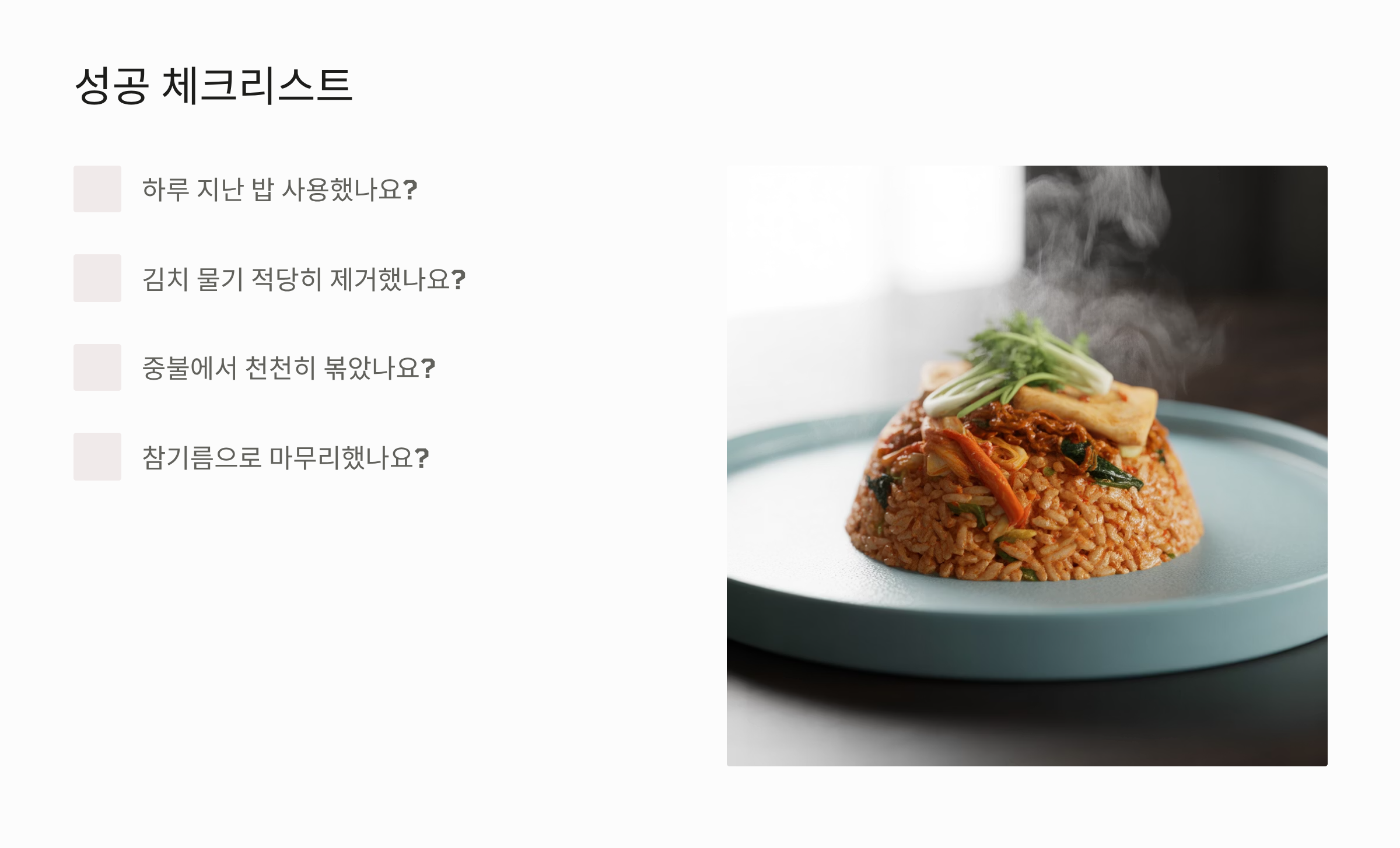 - 김치는 너무 많거나 적으면 밸런스가 깨지므로 적정량을 유지하세요.