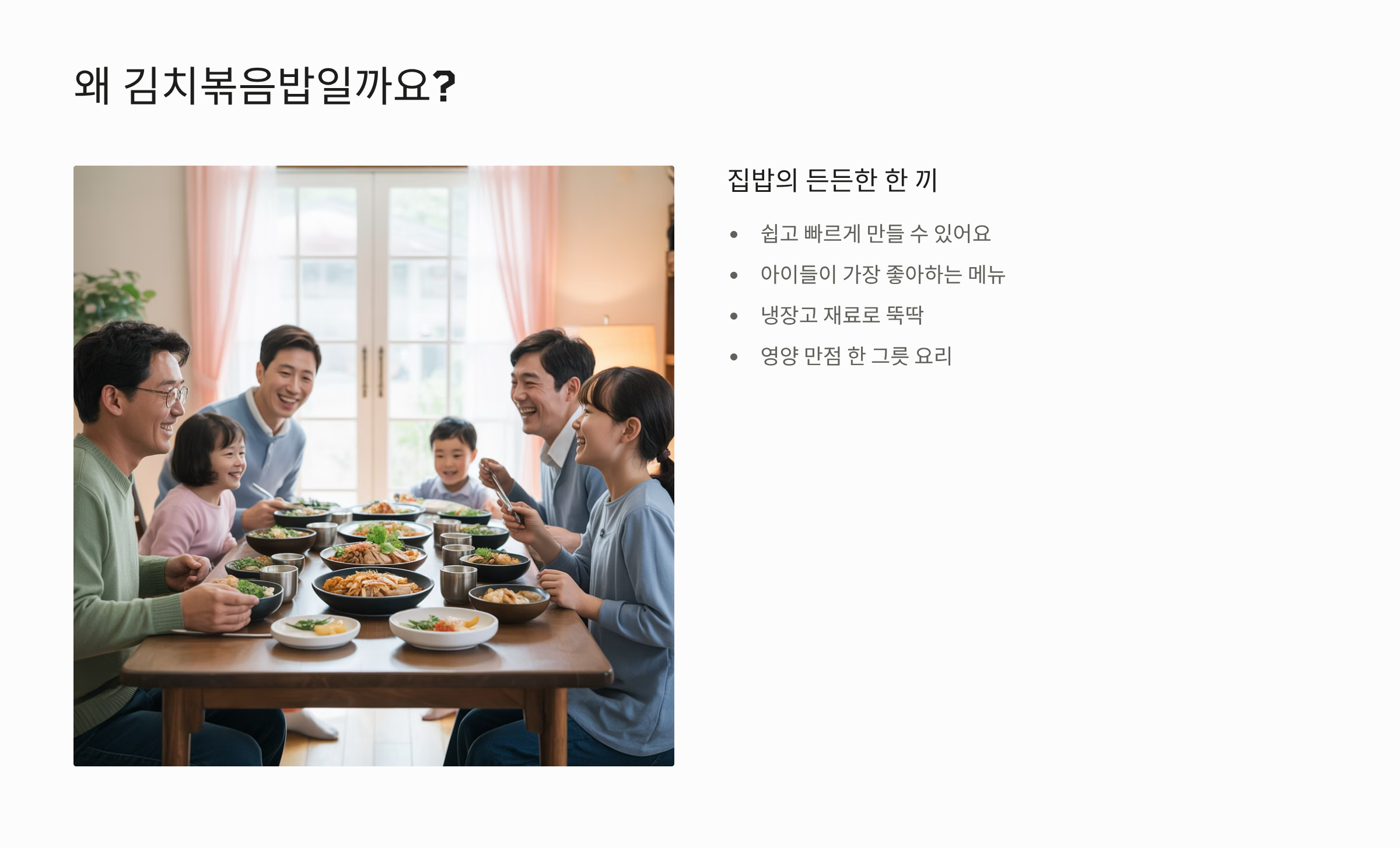 김치볶음밥은 쏟아지는 다양한 음식 중에서도 누구나 쉽고 빠르게 만들 수 있는 최고의 한 그릇 요리입니다. 특히 우리 아이들이 가장 좋아하는 메뉴 중 하나로, 집밥의 든든한 한 끼로 제격이죠.