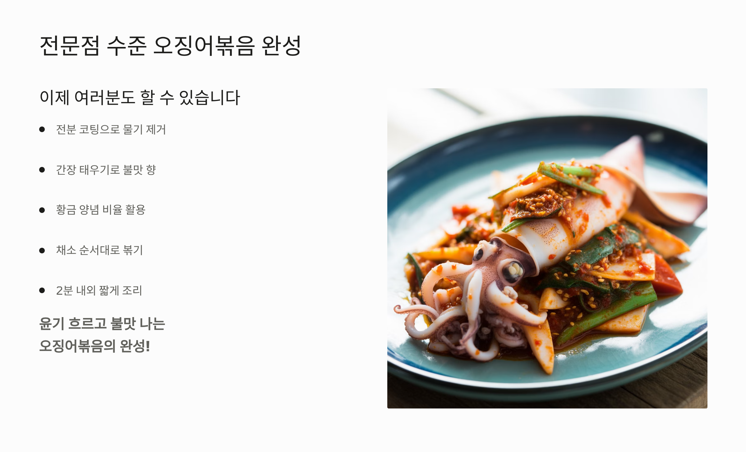 오징어볶음 황금레시피는 오징어에서 물이 흥건하게 나오지 않고, 불맛을 더해 전문점 같은 맛을 내는 것이 핵심입니다.