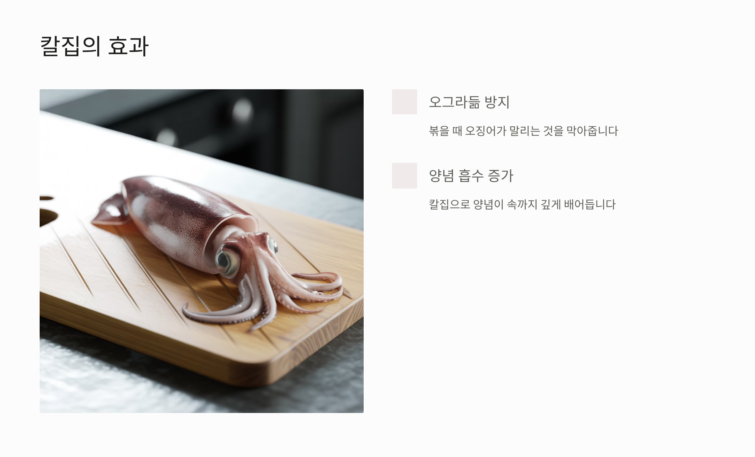 오징어의 비린내를 제거하고 양념이 잘 배어들도록 돕는 손질 노하우가 필요합니다.