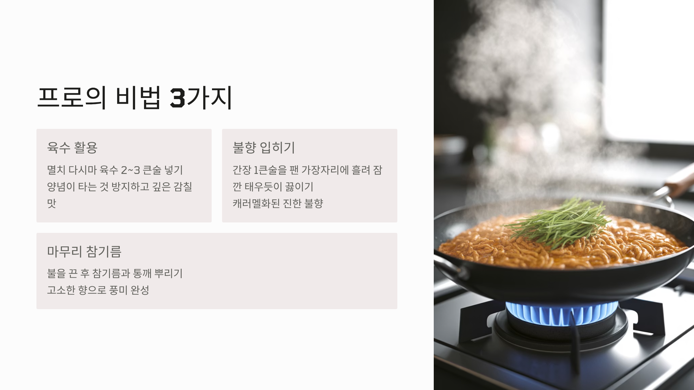 | 참기름 | 1 큰술 | 고소한 향과 윤기 (볶은 후 넣기) |