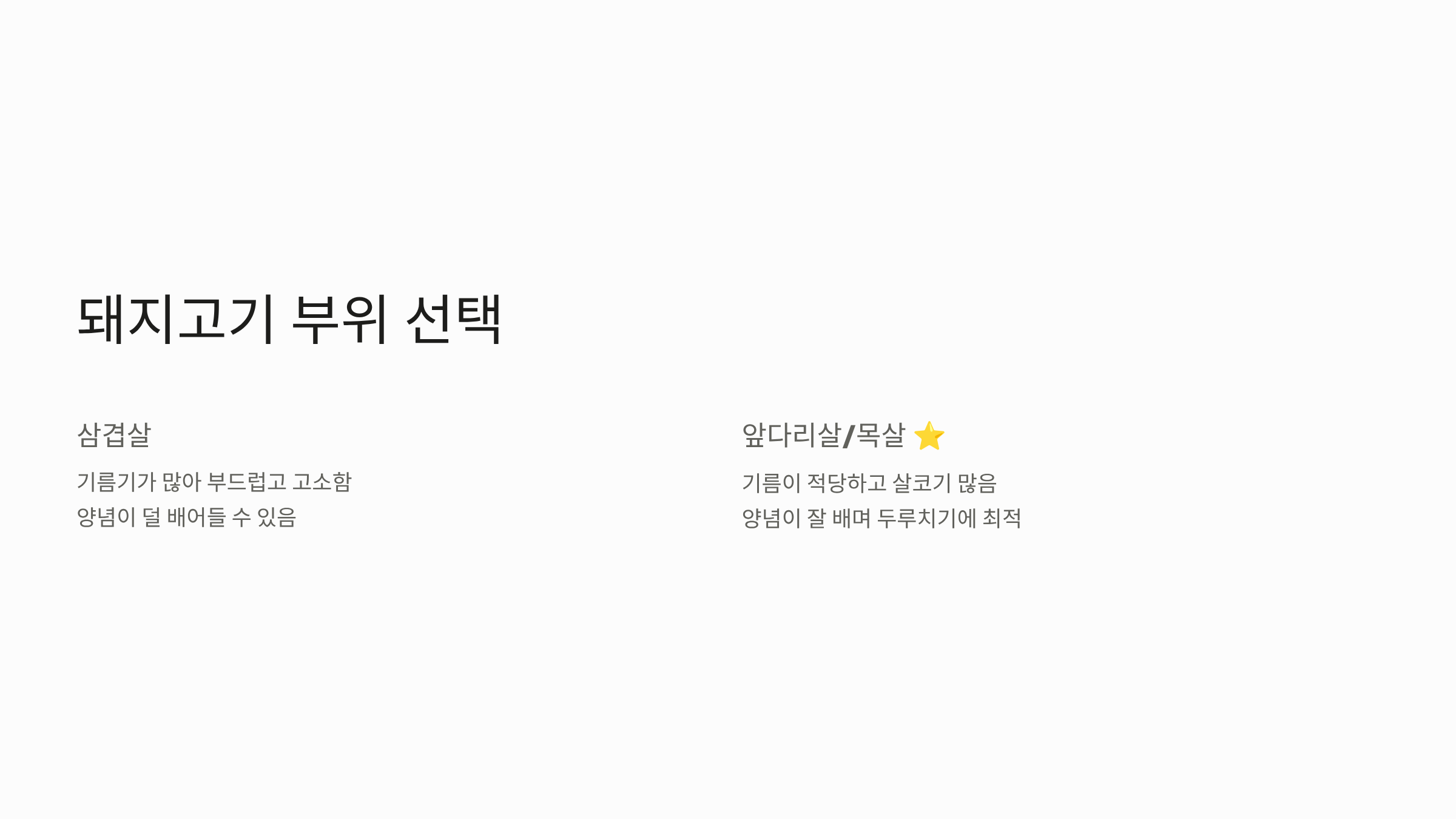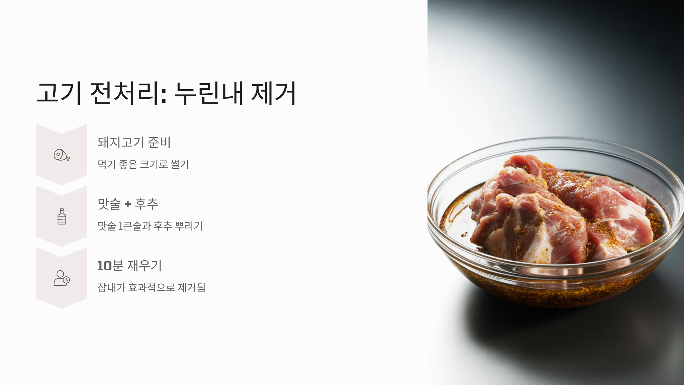 - 고기 전처리 (누린내 제거): 돼지고기를 사용 시, 누린내를 잡는 전처리가 필요합니다. 고기에 맛술 1큰술과 후추를 뿌려 10분 정도 재워두면 잡내가 효과적으로 제거됩니다.