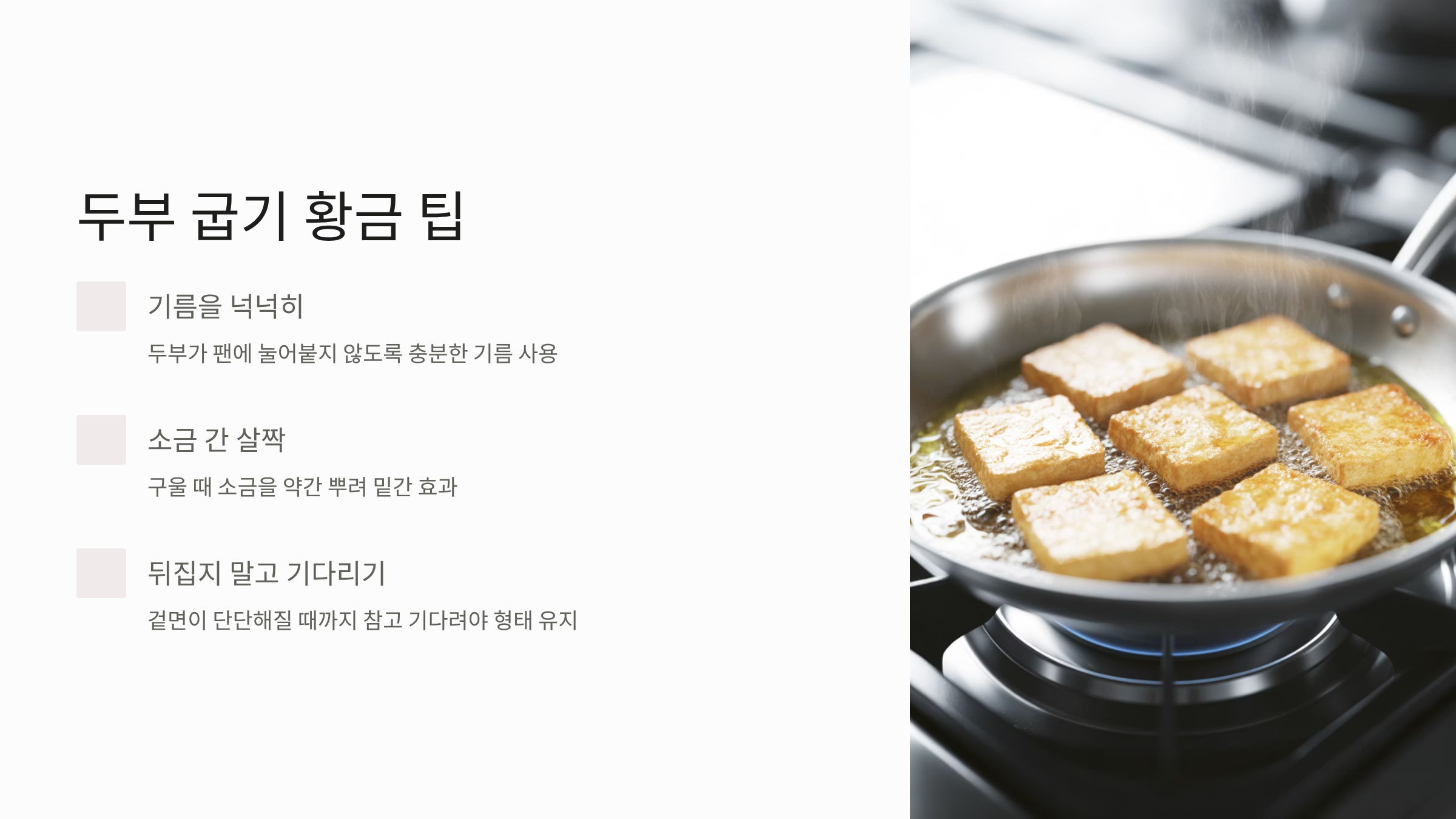 - 두부 전용 간수: 간혹 두부를 끓는 물에 살짝 데쳐 사용하는 레시피도 있지만, 두부의 풍미와 고소함을 살리려면 물기를 제거한 후 팬에 굽는 방법을 추천합니다.