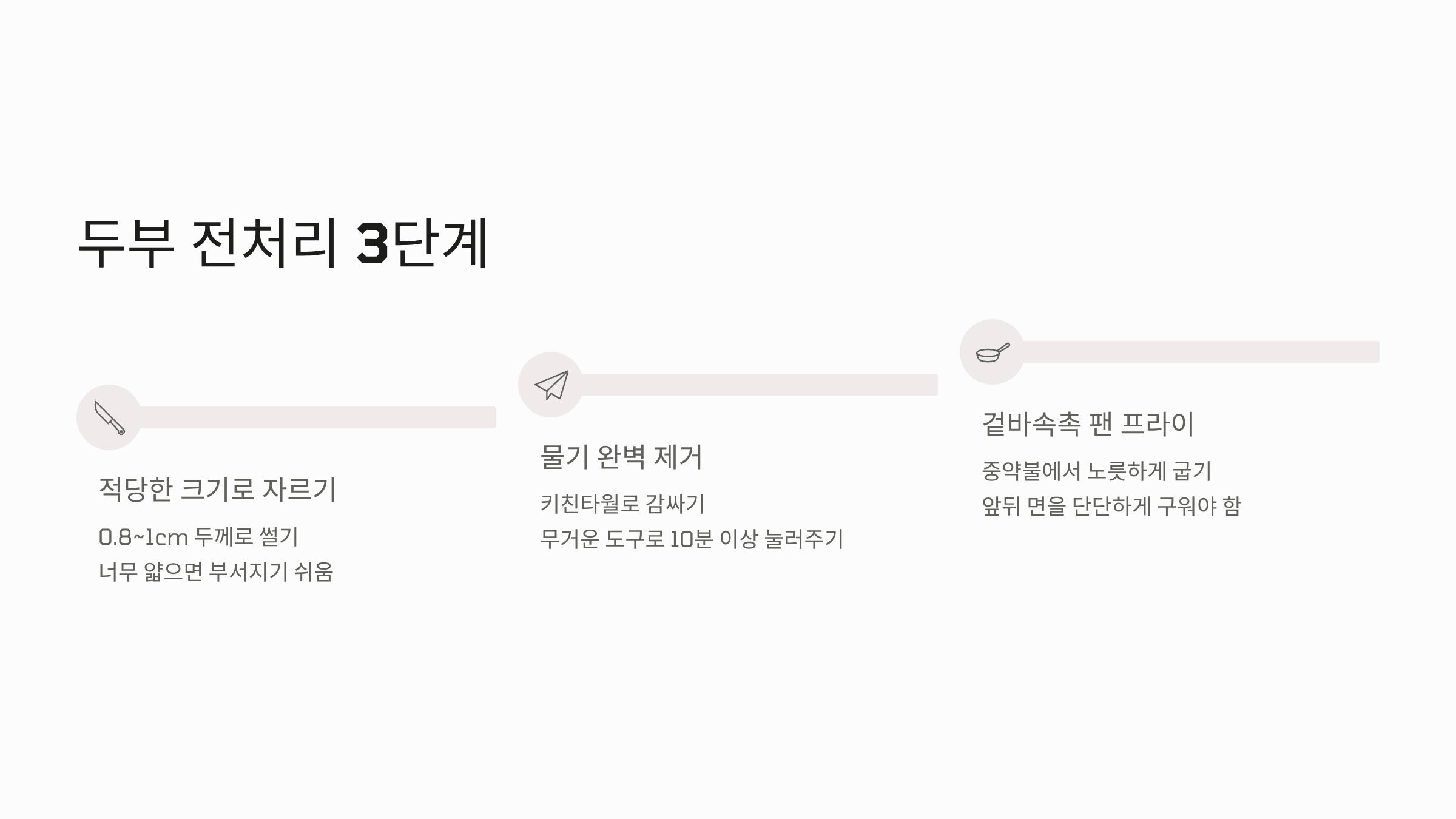 - 겉바속촉 팬 프라이: 물기를 제거한 두부를 중약불에 노릇하게 구워줍니다. 기름을 넉넉히 두르고 앞뒤 면을 단단하게 구워야 볶는 과정에서 부서지지 않고, 양념을 흡수해도 두부의 형태가 유지됩니다. 구울 때 소금 간을 살짝 해주면 밑간이 되어 더욱 맛있습니다.