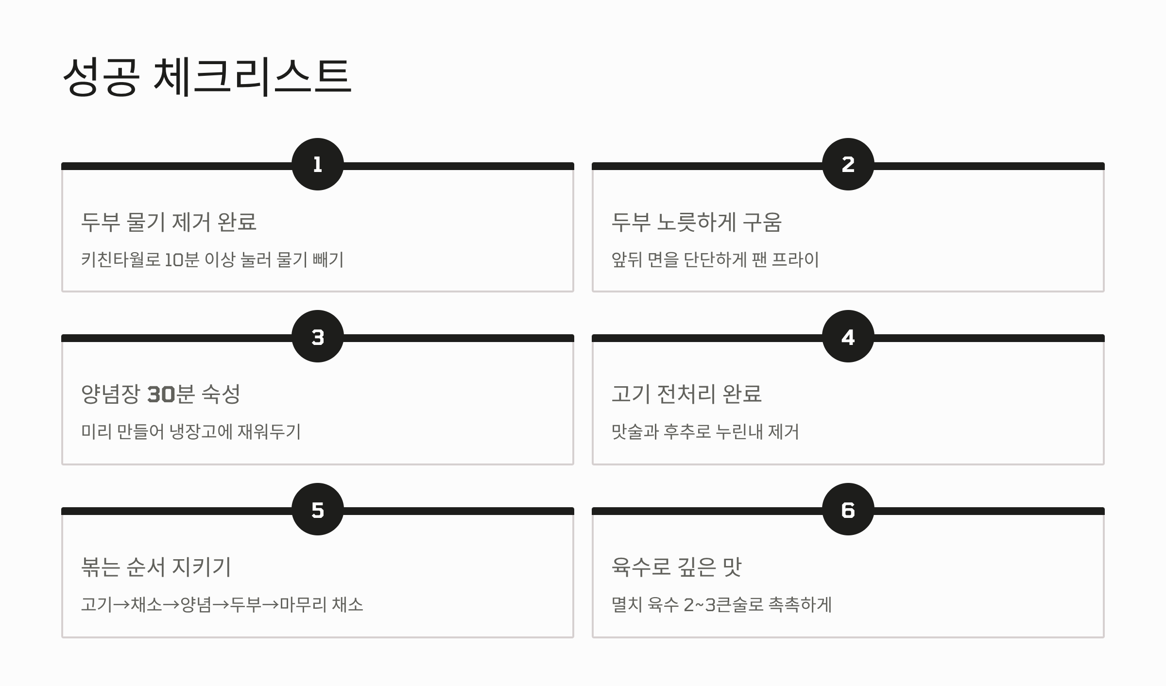 두부 두루치기 황금레시피 성공보장을 위해서는 두부의 물기를 제거하고 노릇하게 구워 부서짐을 방지하는 것이 가장 중요합니다. 돼지고기 앞다리살/목살에 매실액이 들어간 황금 양념장을 숙성시켜 사용하고, 고기-단단한 채소-두부 순으로 볶아 재료의 식감을 살려야 합니다. 여기에 멸치 육수를 살짝 넣어 촉촉하고 깊은 감칠맛을 더하면 성공적인 두부 두루치기를 만들 수 있습니다. 이 글에서 제시된 황금레시피와 꿀팁을 활용하여 맛있는 두부 두루치기를 완성하시기를 바랍니다.