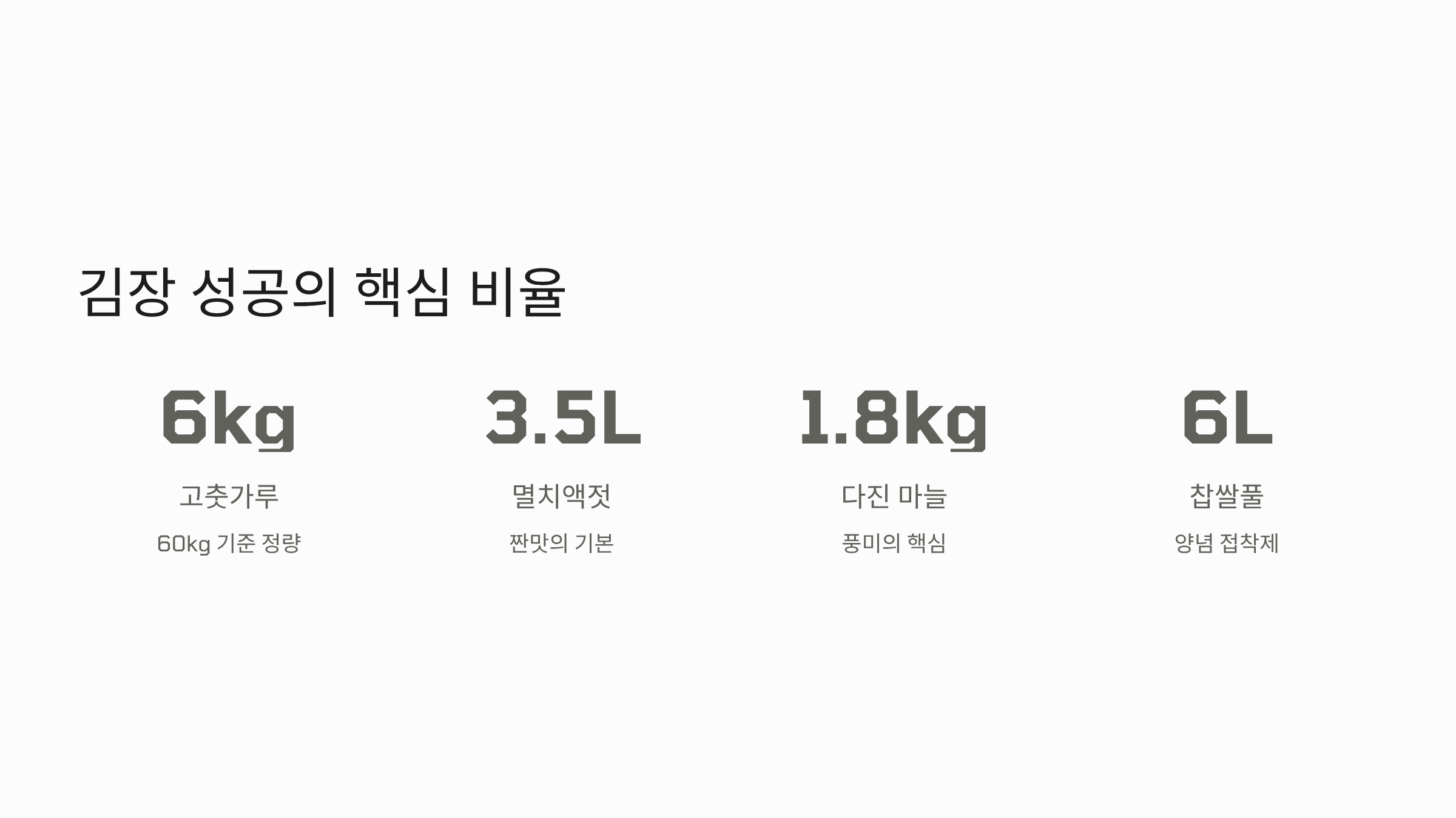 절인 배추 60kg을 기준으로, 김치의 맛을 책임지는 핵심 양념 재료의 정석적인 계량 비율입니다.