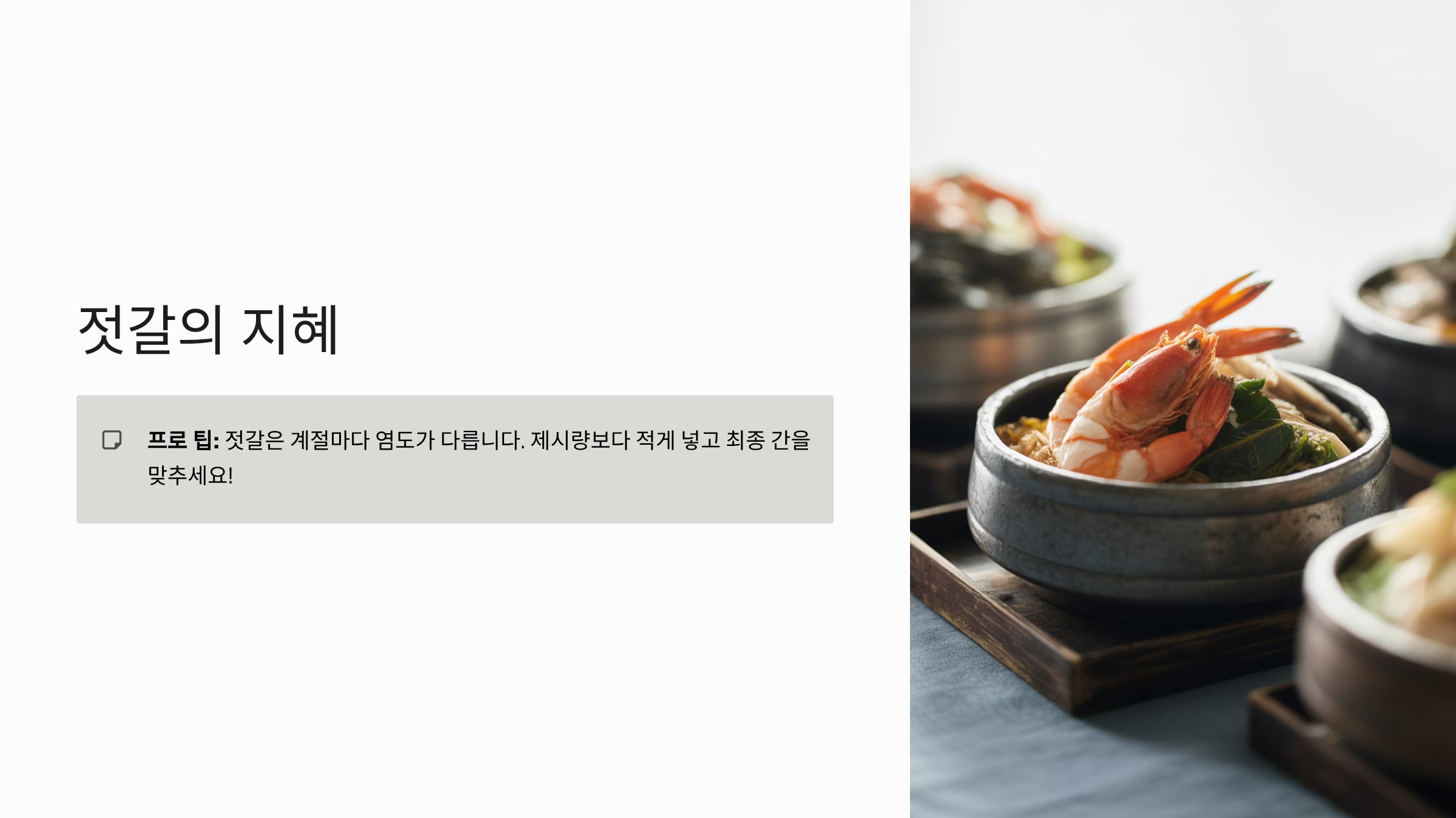 꿀팁: 젓갈은 계절과 숙성도에 따라 염도가 다르므로, 제시된 양보다 적게 넣고 최종 간을 볼 때 추가하는 것이 짠맛 실패를 막는 노하우입니다.