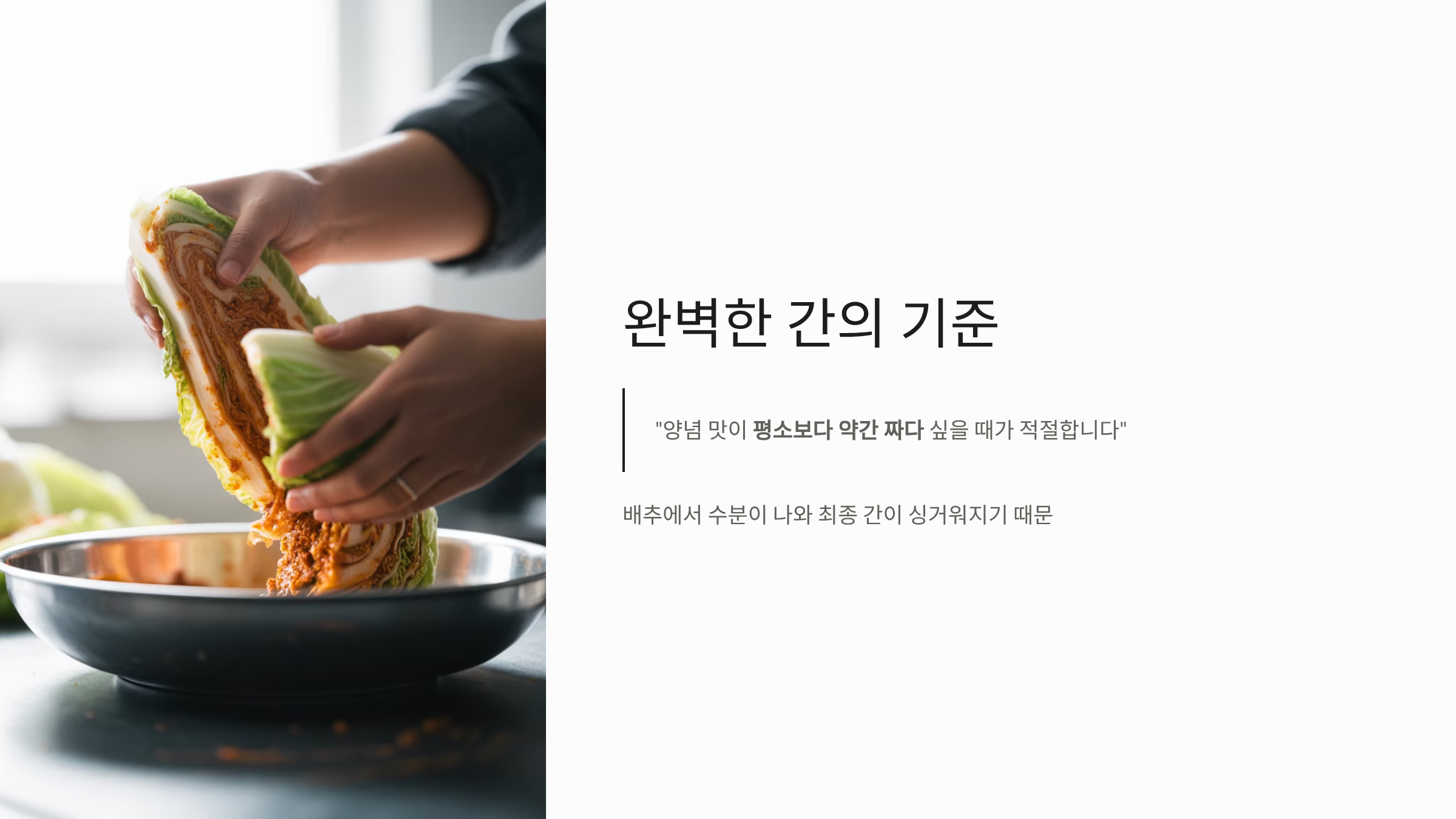 - 맛 테스트: 양념을 완성한 후 양념 맛이 평소보다 약간 짜다 싶을 때가 적절한 간입니다. 양념을 버무리면 배추에서 수분이 나와 최종 간이 조금 싱거워지기 때문입니다.