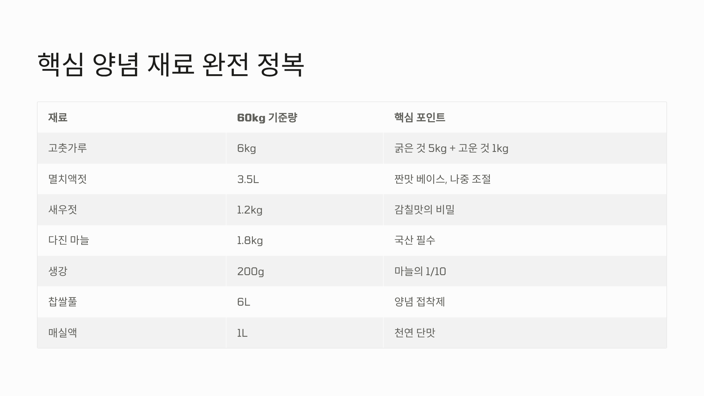 | 양념 재료 | 60kg 기준 권장량 | 비고 및 꿀팁 |