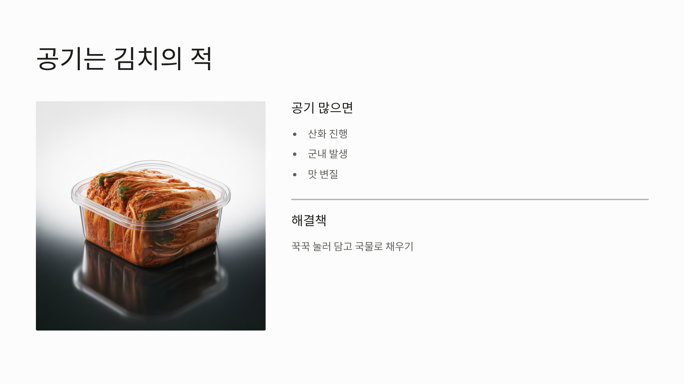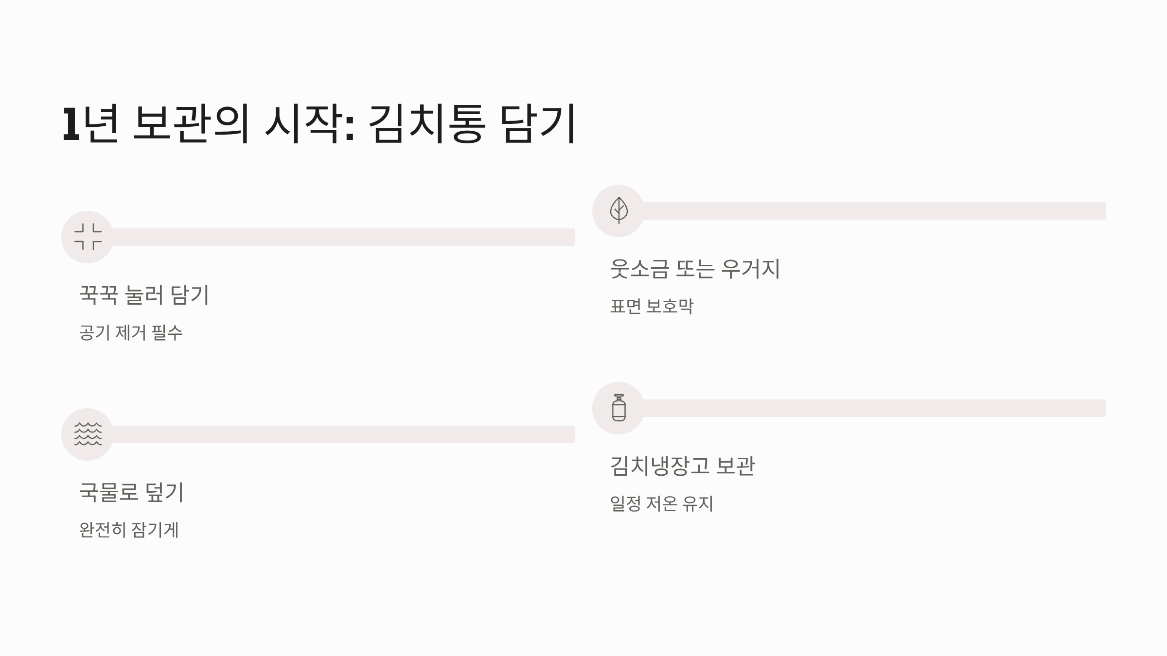 - 꾹꾹 눌러 담기: 양념을 버무린 김치는 김치통에 담을 때 공기가 들어가지 않도록 꾹꾹 눌러 담아야 합니다. 공기가 많이 들어갈 경우 산화가 진행되어 군내가 나거나 맛이 변할 수 있습니다.
