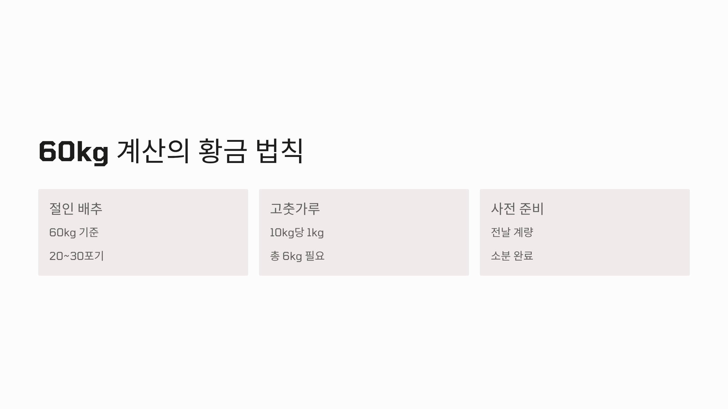 김장김치 60kg은 대략 25~30포기의 배추를 사용하는 대규모 작업입니다. 이처럼 많은 양을 김장할 때는 소량 레시피를 단순히 곱하는 방식으로는 정확한 맛을 내기 어렵고, 재료의 양을 낭비하기 쉽습니다. 김장의 성패는 정확하게 계산된 양념 비율에 달려 있습니다. 양념이 짜거나 밍밍하면 1년 동안 김치를 맛있게 먹을 수 없습니다.
