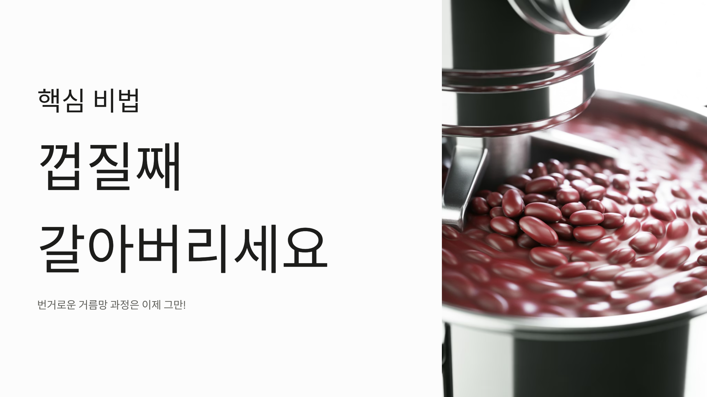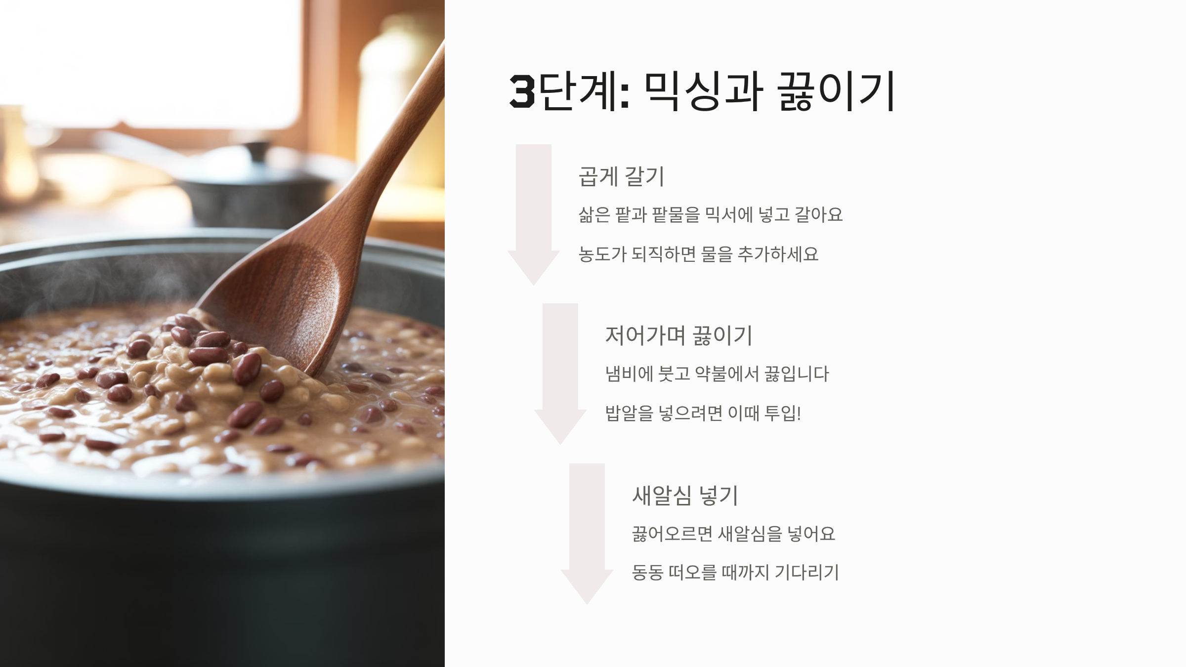 - 통팥 갈아 만들기: 껍질을 걸러내지 않고, 잘 삶아진 팥을 삶은 물과 함께 핸드블렌더나 믹서기로 곱게 갈아버리는 것이 핵심 비법입니다.