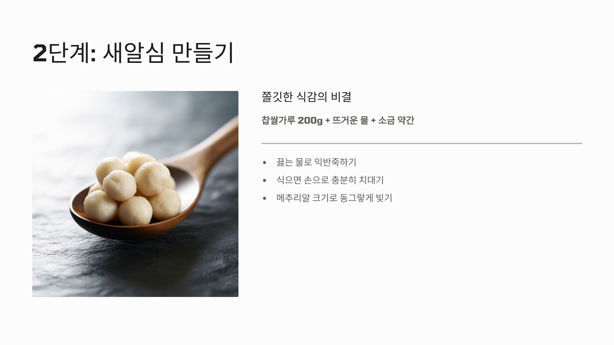 - 재료: 찹쌀가루 200g, 뜨거운 물, 소금 약간.